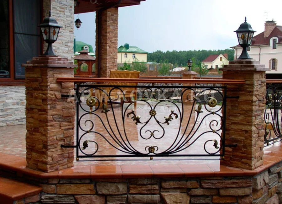 Благородное кованое ограждение, сочетающее в себе теплоту натурального дерева и изысканность художественного металла. Модель спроектирована для оформления открытых террас, веранд и зон отдыха. Конструкция установлена на массивные столбы, облицованные декоративным камнем, что подчеркивает её фундаментальность и надежность. Данная работа является примером высокого мастерства в области художественной металлообработки. Художественная композиция секций строится на симметричном узоре из плавно расходящихся кованых линий, напоминающих веер или раскрывающийся бутон. Центральные и боковые узлы украшены выразительными литыми розетками и бутонами с золотым патинированием. Особенностью модели является широкий деревянный поручень светлого оттенка, который не только обеспечивает комфорт при прикосновении, но и создает стильный контраст с черным металлом каркаса. Металлические элементы защищены долговечным антикоррозийным покрытием, устойчивым к внешним воздействиям. Этот проект идеально подходит для загородных резиденций, гармонируя с ландшафтным дизайном и архитектурой из природного камня.