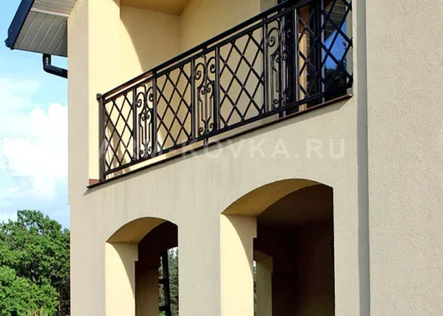 Стильное и графичное балконное ограждение, сочетающее строгую геометрию с элементами художественной ковки. Модель идеально подходит для оформления современных загородных домов и коттеджей, где ценится лаконичность и четкость линий. Данная работа является примером профессионального проектирования и металлообработки для частных жилых объектов. Основу дизайна составляет ритмичная сетка из диагонально пересекающихся прутьев, образующих ромбовидный узор. Эта геометрическая строгость эффектно разбавлена вертикальными декоративными вставками, украшенными изящными S-образными волютами и коваными завитками. Изделие выполнено из качественного металлического профиля с глубоким черным матовым покрытием, которое обеспечивает надежную защиту от коррозии и выгодно контрастирует со светлым фасадом здания. Конструкция дополнена массивным прямоугольным поручнем, обеспечивающим комфорт и безопасность эксплуатации. Ограждение надежно закреплено между несущими колоннами, создавая целостный и завершенный архитектурный образ балконной зоны. Проект разработан с учетом требований к прочности и долговечности наружных металлоконструкций.