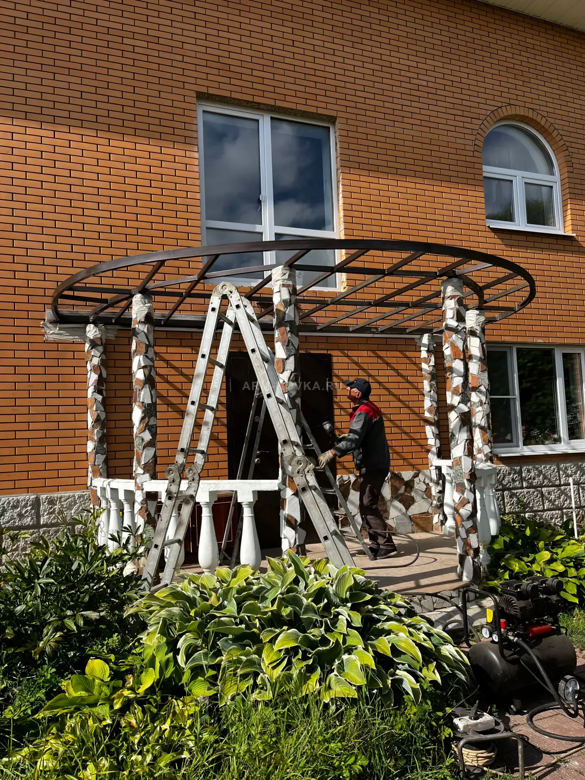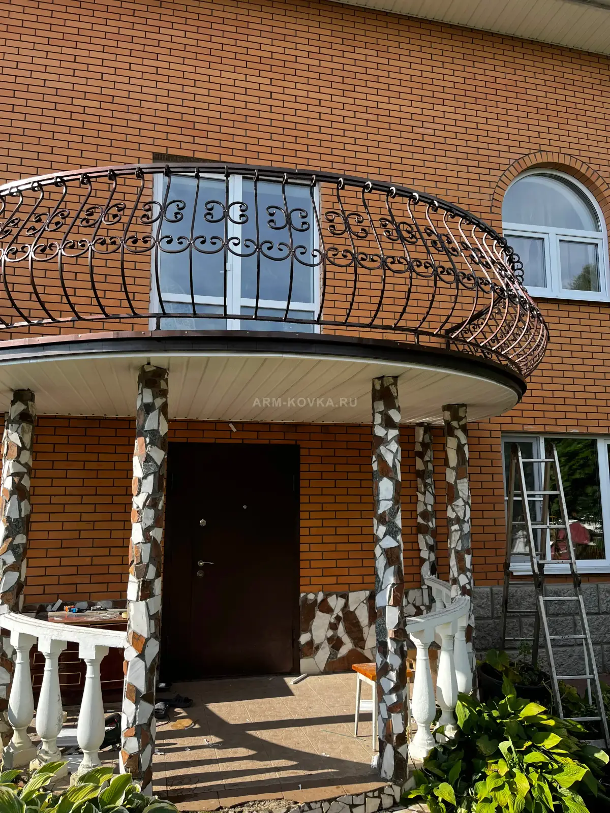 Элегантное и воздушное кованое ограждение, спроектированное специально для полукруглых балконных плит. Модель отличается динамичным дизайном: вертикальные прутья имеют плавный изгиб наружу («вылет»), что визуально расширяет пространство балкона и придает фасаду дома более объемный, рельефный вид. Изделие выполнено из качественного металла с защитным покрытием темно-коричневого цвета, идеально гармонирующим с кирпичной кладкой. Художественное оформление калитки построено на ритмичном повторении классических S-образных волют и изящных завитков в верхней и нижней частях секций. Радиусная форма поручня и нижнего пояса выполнена с высокой точностью, обеспечивая идеальное прилегание к основанию площадки. Данная работа является примером профессиональной металлообработки для частных домов в Истринском районе. Конструкция сочетает в себе надежность защитного барьера и легкость кузнечного узора, создавая завершенный архитектурный ансамбль входной группы над крыльцом.