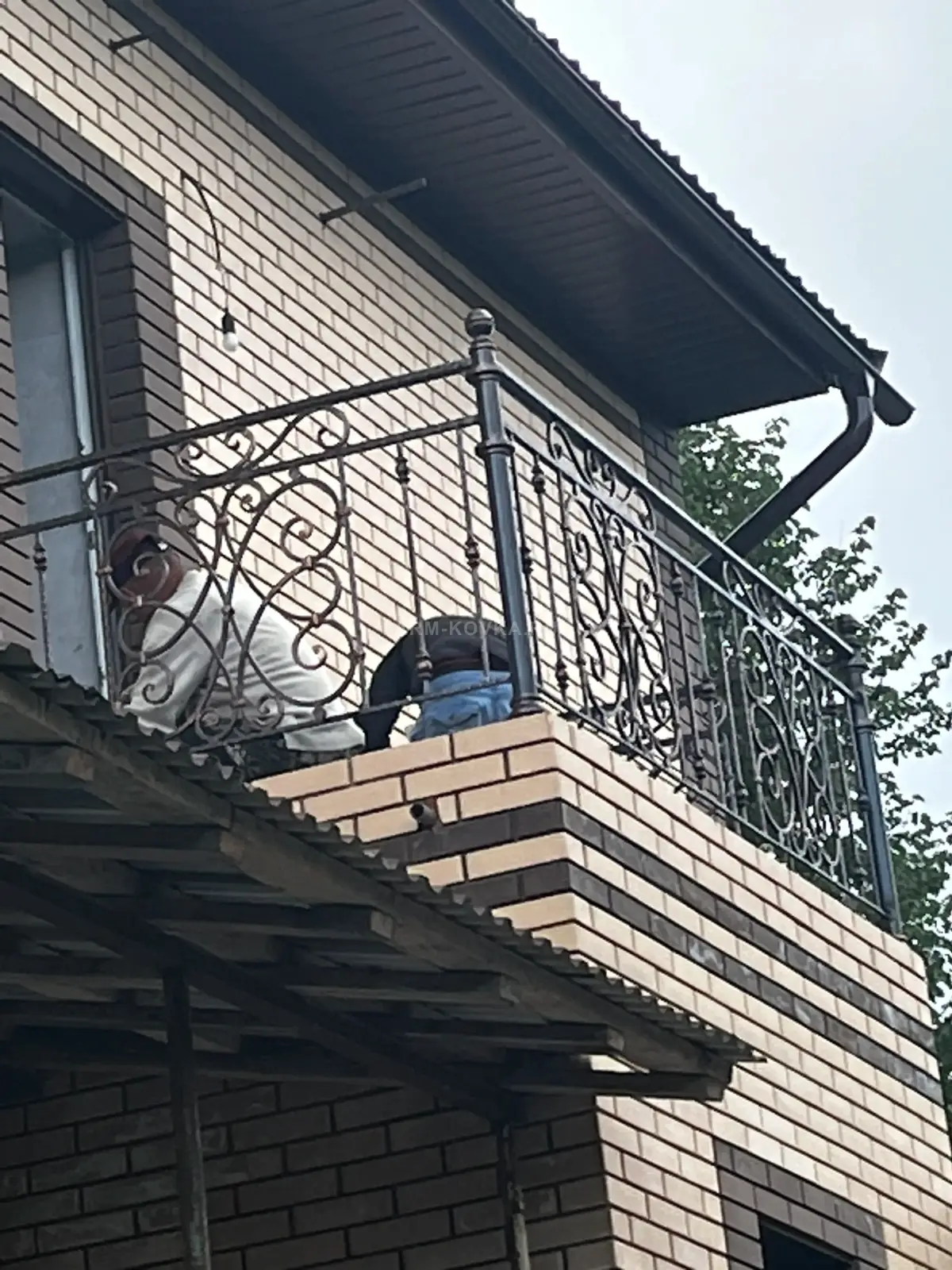 Элегантное и воздушное кованое ограждение, спроектированное специально для полукруглых балконных плит. Модель отличается динамичным дизайном: вертикальные прутья имеют плавный изгиб наружу («вылет»), что визуально расширяет пространство балкона и придает фасаду дома более объемный, рельефный вид. Изделие выполнено из качественного металла с защитным покрытием темно-коричневого цвета, идеально гармонирующим с кирпичной кладкой. Художественное оформление калитки построено на ритмичном повторении классических S-образных волют и изящных завитков в верхней и нижней частях секций. Радиусная форма поручня и нижнего пояса выполнена с высокой точностью, обеспечивая идеальное прилегание к основанию площадки. Данная работа является примером профессиональной металлообработки для частных домов в Истринском районе. Конструкция сочетает в себе надежность защитного барьера и легкость кузнечного узора, создавая завершенный архитектурный ансамбль входной группы над крыльцом.