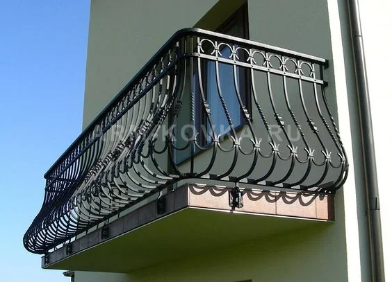 Изящное и функциональное балконное ограждение, выполненное в стиле классической ковки с акцентом на визуальное расширение пространства. Модель отличается выраженным дугообразным изгибом вертикальных стоек (так называемым «вылетом» или «пузом»), что не только придает конструкции объем, но и создает дополнительное полезное место на балконной плите. Данное изделие является результатом профессиональной металлообработки и проектирования. Дизайн ограждения сочетает в себе несколько декоративных поясов. Верхняя часть оформлена строгим геометрическим рядом из колец, заключенных в прямоугольные рамки под массивным поручнем. Средний ярус сформирован из чередующихся гладких и торсированных (витых) прутьев, украшенных лаконичными коваными перехватами. Нижняя часть акцентирована декоративным рядом кованых элементов, напоминающих лилии или трезубцы, которые придают конструкции художественную завершенность. Ограждение имеет глубокое черное матовое покрытие, подчеркивающее графичность узора на фоне светлого фасада здания. Проект разработан с учетом строгих норм безопасности и долговечности для частных жилых объектов.