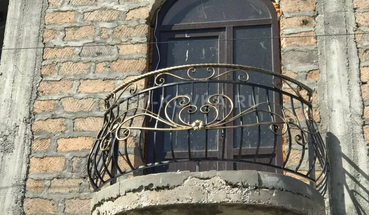 Компактное и выразительное ограждение для полукруглого балкона, сочетающее классическую кузнечную форму с яркими декоративными акцентами. Модель спроектирована с плавным выпуклым изгибом («пузом»), который не только подчеркивает геометрию бетонного основания, но и визуально расширяет пространство балконной площадки. Данная работа является примером качественной металлообработки для объектов в частном секторе. Основой дизайна служит массивный витой поручень, имитирующий канат, который выделен контрастным золотым покрытием. Центральная часть композиции украшена симметричным узором из плавно изогнутых прутьев, сходящихся к декоративному кованому цветку. Боковые секции дополнены изящными завитками и волютами в верхней части, также подчеркнутыми золотой патиной. Темный основной цвет каркаса отлично сочетается с отделкой фасада из натурального туфа, характерной для местной архитектуры. Конструкция надежно закреплена в бетонное основание, обеспечивая высокий уровень безопасности и долговечности входной группы. Изделие спроектировано с учетом требований к устойчивости и эстетике загородного жилья.