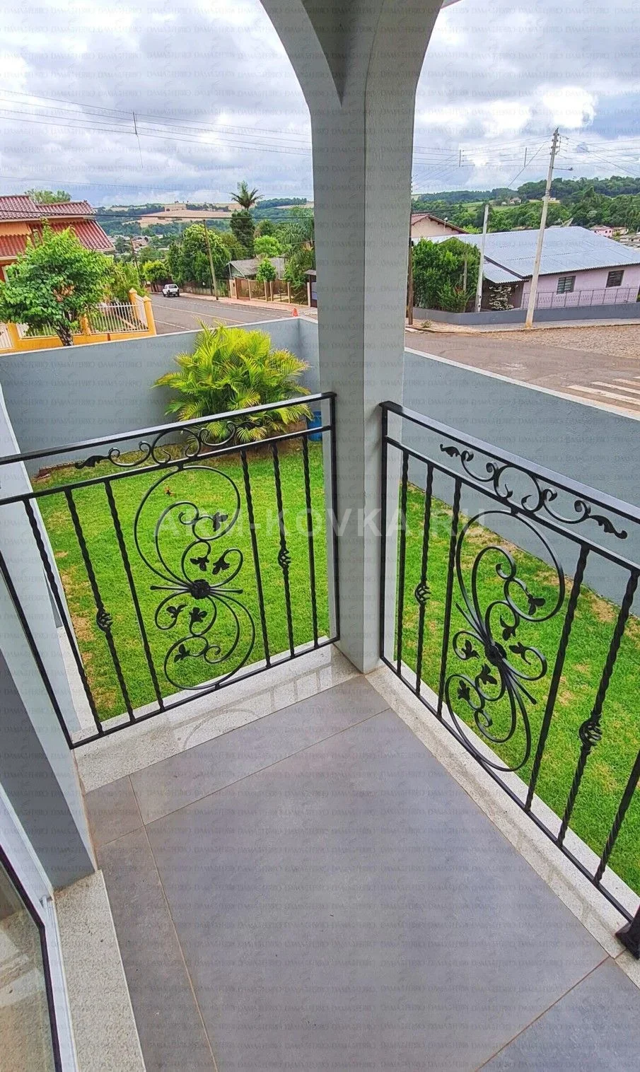 Легкое и изящное кованое ограждение для открытых террас и балконов, выполненное в стиле лаконичной классики. Конструкция состоит из прямых секций, которые обеспечивают надежную защиту периметра, сохраняя при этом ощущение открытости и панорамный обзор. Данная модель является примером профессионального подхода к благоустройству частных территорий. Художественная композиция каждой секции строится вокруг центрального симметричного узора из плавных волют, напоминающих изгибы растений. Декоративные элементы дополнены небольшими коваными листьями, что придает рисунку природную мягкость. Вертикальное наполнение чередует гладкие прутья и торсированные (витые) стойки с изящными «корзинками», создавая ритмичный и эстетически приятный вид. Верхний декоративный пояс украшен волнообразными завитками под тонким функциональным поручнем. Изделие окрашено в глубокий черный цвет, который контрастно выделяется на фоне светлой отделки пола и колонн. Конструкция отличается простотой монтажа и долговечностью, идеально подходя для оформления уютных зон отдыха загородных домов.