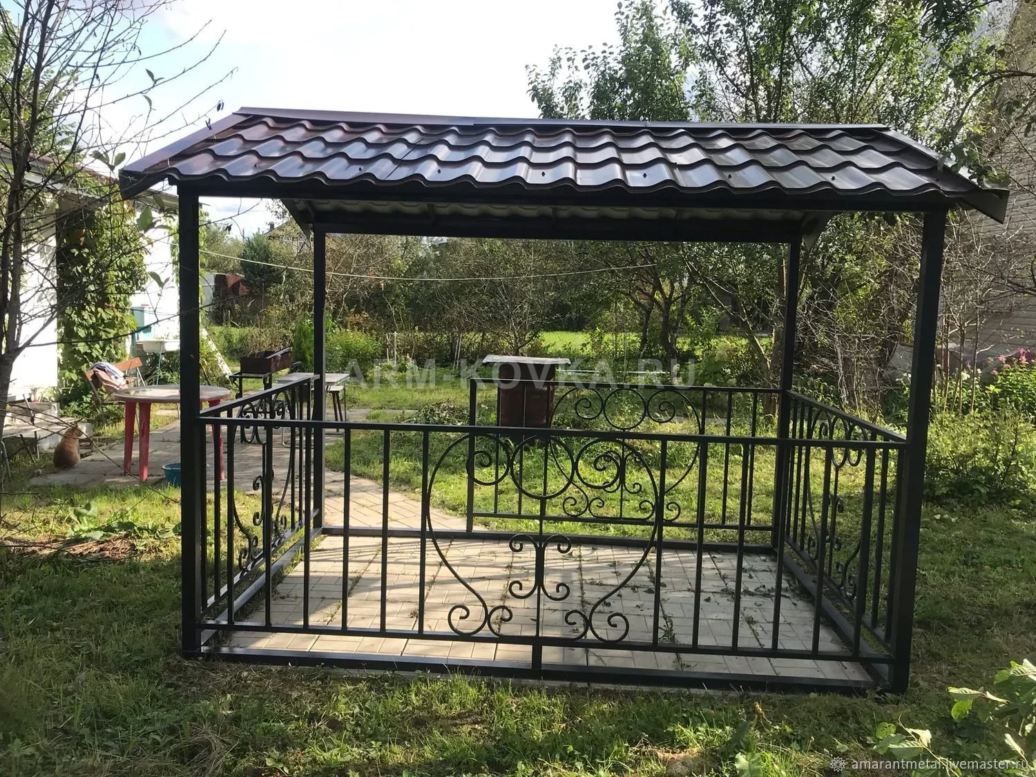 Лаконичная и функциональная прямоугольная беседка, созданная для комфортного отдыха на садовом участке. Модель сочетает в себе надежность сварного каркаса и декоративность элементов художественной ковки. Данный проект является примером качественной металлообработки, ориентированной на создание практичного и долговечного пространства для частных домов в Истринском районе. Конструкция базируется на прочных стойках из профильной трубы, обеспечивающих высокую устойчивость строения. Главным декоративным акцентом является центральное панно в виде сердца, дополненное изящными S-образными завитками и волютами, что придает беседке романтичный и приветливый вид. Вертикальное наполнение ограждения выполнено из тонкого прута, сохраняющего визуальную легкость и открытость конструкции. Двускатная крыша с покрытием из качественной металлочерепицы надежно защищает от осадков и солнца, гармонируя с традиционной загородной архитектурой. Металлические элементы покрыты защитной антикоррозийной краской глубокого черного цвета, что гарантирует долгий срок службы изделия в условиях открытого воздуха. Беседка установлена на мощеную площадку, создавая готовую зону для размещения садовой мебели или мангала.