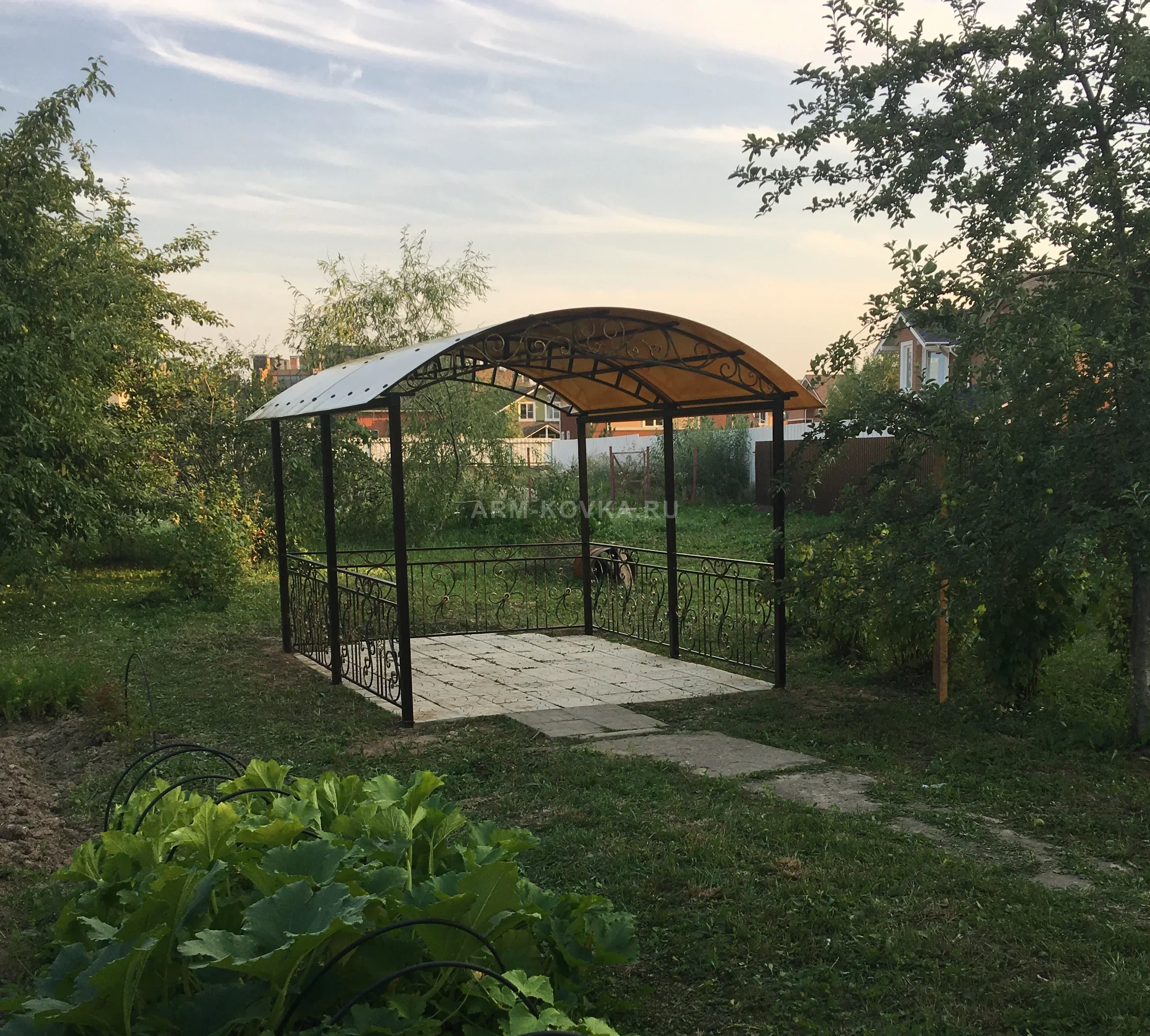 Легкая и открытая прямоугольная беседка, представляющая собой идеальное решение для создания затененной зоны отдыха в глубине сада. Конструкция сочетает в себе функциональность навеса и изящество художественной ковки, гармонично вписываясь в ландшафт с обилием зелени. Данная работа выполнена в рамках профессиональной деятельности по металлообработке для частных загородных участков. Каркас беседки базируется на шести стройных опорах из стального профиля, обеспечивающих надежность и устойчивость всей системы. Художественное наполнение ограждения представлено ритмичным узором из классических S-образных завитков и волют, дополненных небольшими коваными акцентами. Под сводом арочной крыши расположен декоративный кованый фриз, который визуально облегчает конструкцию фронтона. Кровля выполнена из сотового поликарбоната теплого медового оттенка, который мягко рассеивает солнечный свет, защищая при этом от ультрафиолета и осадков. Беседка установлена на подготовленную площадку из светлой тротуарной плитки, что подчеркивает аккуратность и завершенность зоны отдыха. Изделие защищено качественным темным антикоррозийным покрытием, гарантирующим долгий срок службы в условиях открытой садовой среды. Проект идеально подходит для размещения обеденной группы или организации летней кухни на свежем воздухе.