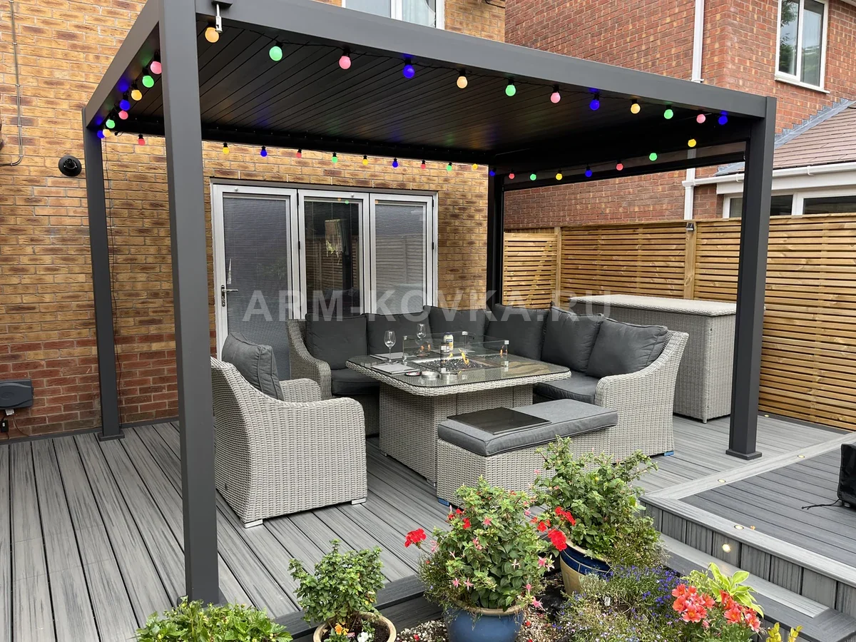 Современная алюминиевая пергола, представляющая собой идеальное решение для создания уютной лаунж-зоны непосредственно у стен дома. Конструкция выполнена в стиле минимализм, где строгие геометрические формы сочетаются с высокой функциональностью и комфортом. Данный проект является результатом профессионального подхода к металлообработке, ориентированным на создание долговечных и эстетичных объектов для частного сектора. Каркас беседки изготовлен из высококачественного алюминиевого профиля с матовым порошковым напылением глубокого серого цвета, обеспечивающего защиту от коррозии и выгорания на солнце. Плоская крыша оснащена системой регулируемых ламелей, которые позволяют менять уровень освещенности и обеспечивать вентиляцию террасы. Особенностью данной инсталляции является праздничная гирлянда с разноцветными лампами, создающая атмосферу вечернего уюта и тепла. Внутреннее пространство павильона укомплектовано премиальной мебелью из искусственного ротанга: просторным угловым диваном, креслом и многофункциональным столом с закаленным стеклом. Пергола установлена на террасную доску (декинг), а периметр украшен живыми цветами в керамических кашпо, что подчеркивает завершенность композиции. Это надежное и стильное решение для благоустройства территории, сочетающее в себе приватность и современный дизайн.