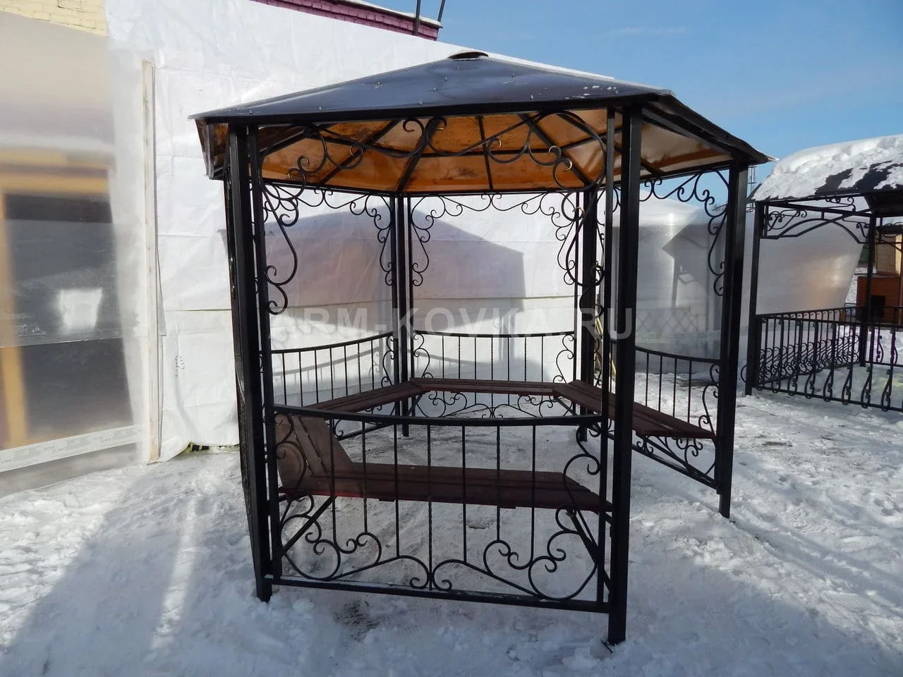 Практичная и надежная кованая беседка шестигранной формы, сочетающая в себе функциональность и эстетику художественного металла. Модель разработана как готовое решение для обустройства зоны отдыха на дачном или приусадебном участке. Данная конструкция является примером качественной металлообработки, ориентированной на долговечность и удобство эксплуатации. Особенностью модели является интегрированная система посадочных мест: по периметру внутренних секций установлены прочные деревянные лавки, что позволяет с комфортом разместить компанию из 6–8 человек. Декоративное наполнение выполнено в классическом стиле с использованием изящных S-образных завитков и волют в нижней и верхней частях секций. Купольная шестискатная крыша из металлического листа или поликарбоната обеспечивает надежную защиту от осадков. Весь каркас покрыт антикоррозийным составом черного цвета, устойчивым к перепадам температур и влажности. Благодаря своей жесткой конструкции, беседка не требует сложного фундамента и может быть установлена на любую ровную площадку. Это профессиональное решение для тех, кто ищет оптимальное соотношение цены и качества для благоустройства территории в Истринском районе.