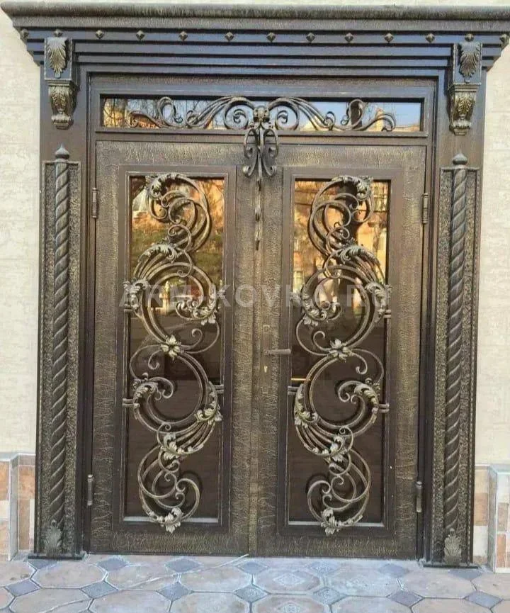 Архитектурная входная группа премиум-класса, созданная для масштабных загородных резиденций и особняков. Эта модель представляет собой законченное фасадное решение, включающее не только массивные дверные полотна, но и величественный декоративный портал. Конструкция воплощает в себе эстетику классицизма, обеспечивая при этом высший уровень безопасности и теплоизоляции. Дверная группа оснащена зеркальными стеклопакетами, которые наполняют холл естественным светом, сохраняя приватность интерьера. Поверх остекления установлены сложные симметричные кованые решетки с барочным орнаментом: крупные волюты, переплетающиеся с акантовыми листьями и цветочными розетками. Особенностью модели является массивный портал, обрамленный витыми полуколоннами и увенчанный карнизом с декоративными кронштейнами и лепными элементами. Поверхность металла имеет выраженную фактуру и защищена антикоррозийным покрытием с глубоким бронзовым патинированием. Двустворчатая конструкция позволяет с комфортом проносить крупногабаритные предметы, а усиленная фурнитура и замковые системы высшего класса обеспечивают надежную защиту. Входная группа «Версальский Дворец» — это торжественный аккорд в облике вашего дома в Истринском районе, подчеркивающий безупречный вкус владельца.