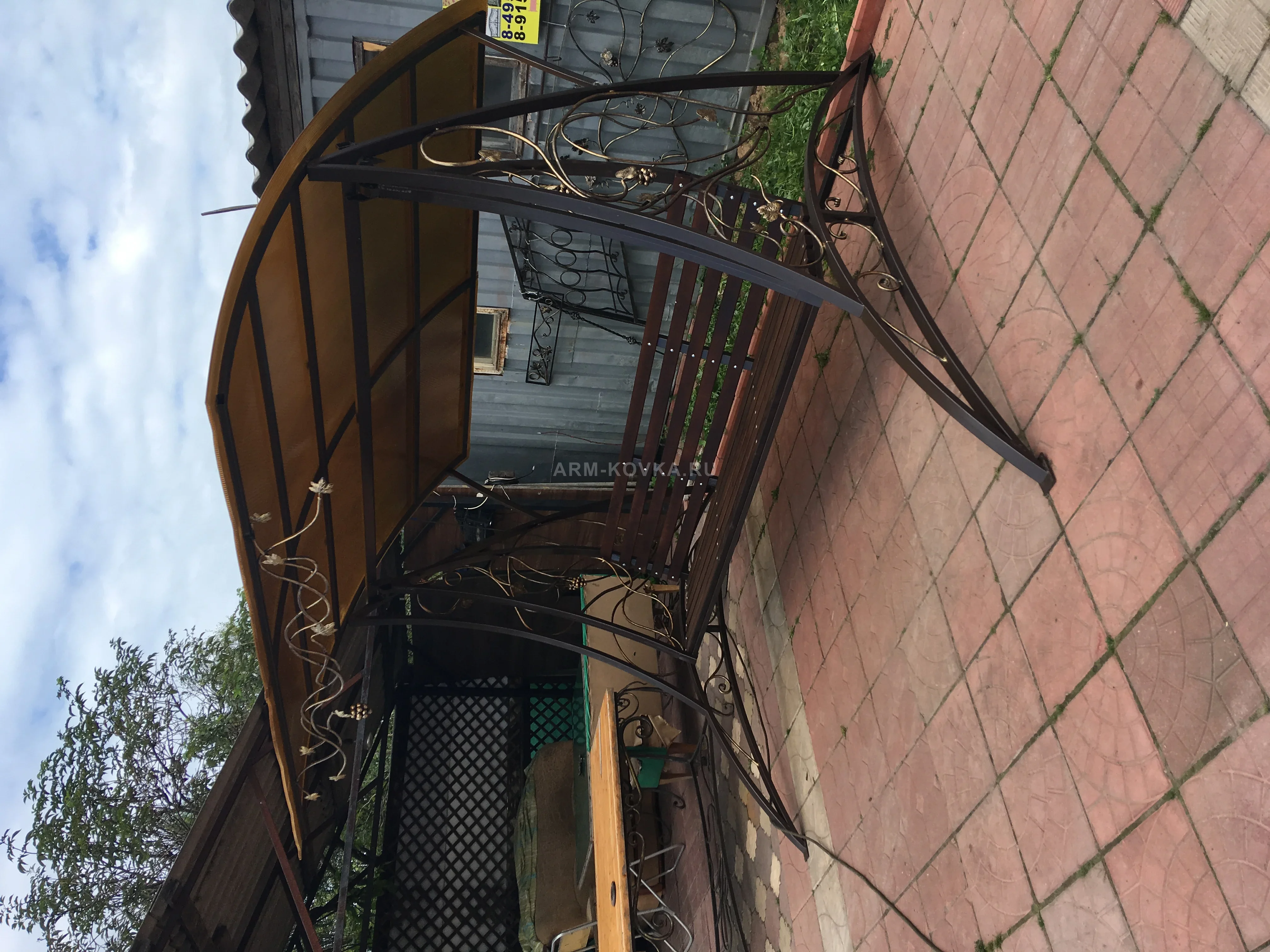 Данная модель представляет собой монументальную зону отдыха, отличающуюся увеличенными габаритами и изысканным тематическим декором. Главной особенностью конструкции являются массивные боковые опоры в форме полумесяцев, украшенные сложной художественной ковкой, имитирующей переплетение виноградной лозы с металлическими гроздьями и листьями. Кованые элементы вручную покрыты золотистой патиной, что создает эффектный контраст на фоне матового темно-коричневого каркаса. Сиденье качелей обладает увеличенной шириной, что позволяет с комфортом разместить до четырех взрослых человек. Облицовка выполнена из прочных деревянных ламелей темно-коричневого цвета, которые закреплены на стальном основании болтовым соединением. Эргономичный наклон спинки и плавный ход подвесной системы обеспечивают идеальные условия для длительного отдыха. Широкий разлет опорных дуг в нижней части гарантирует устойчивость конструкции даже при активном раскачивании, предотвращая опрокидывание. Навес арочного типа выполнен из сотового поликарбоната теплого медового оттенка. Особенностью кровли является дополнительный кованый карниз по фронтальной части, который также поддерживает общую стилистику «виноградной лозы». Поликарбонат надежно защищает отдыхающих от ультрафиолета и осадков, а его цвет создает эффект солнечного дня даже в пасмурную погоду. Эта модель идеально подойдет для больших семей и станет центральным украшением просторной террасы или открытого газона.