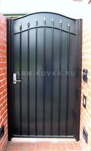 Строгая и элегантная кованая калитка закрытого типа, выполненная в стиле английской классики. Конструкция представляет собой сплошной металлический лист с глубоким черным матовым покрытием, усиленный вертикальными ребрами жесткости. Верхняя часть калитки имеет плавный арочный изгиб, под которым расположен декоративный ряд из классических литых пик серебристого цвета. Такое сочетание обеспечивает полную приватность территории и высокую степень безопасности, при этом сохраняя эстетическую привлекательность входной группы. Калитка установлена в проем между кирпичными столбами, идеально дополняя архитектуру домов из красного или облицовочного кирпича. Модель оснащена эргономичной нажимной ручкой и современным врезным замком, гарантируя удобство и надежность в повседневной эксплуатации.