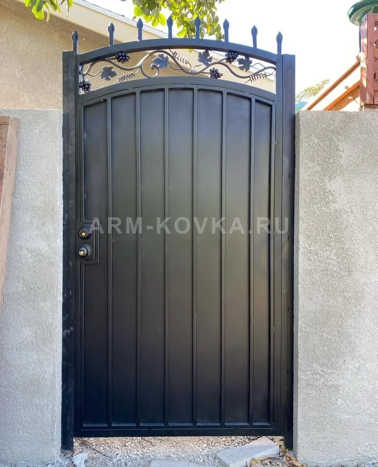 Элегантная кованая калитка закрытого типа, сочетающая в себе приватность сплошного полотна и изящество художественного декора. Основная часть изделия представляет собой глухой металлический щит с вертикальными ребрами жесткости, окрашенный в благородный черный матовый цвет. Верхняя часть калитки оформлена в виде арочной фрамуги, украшенной кованой виноградной лозой с детализированными листьями и гроздьями ягод. Венчает конструкцию ряд защитных остроконечных пик, повторяющих изгиб арки. Калитка установлена в проем со светлыми оштукатуренными стенами, что создает приятный визуальный контраст и подчеркивает графичность металлических линий. Модель оснащена надежным замком с круглой ручкой, идеально подходя для оформления входа в частный сад или внутренний дворик.