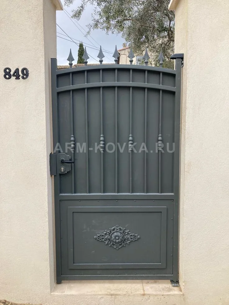Благородная кованая калитка закрытого типа, выполненная в сером антрацитовом цвете с матовым финишем. Конструкция отличается выразительным разделением на функциональные зоны: нижняя часть представлена глухим прямоугольным цоколем с накладным барельефным элементом в виде классической цветочной розетки. Средняя часть калитки закрыта цельным металлическим листом, поверх которого расположены вертикальные прутья с объемными декоративными вставками-балясинами. Верхняя секция имеет плавный арочный изгиб и дополнена рядом защитных литых пик, что придает изделию завершенный и строгий вид. Калитка установлена в проем светлого оштукатуренного ограждения, создавая эффектный контраст и подчеркивая архитектурный стиль входной группы. Модель оснащена надежным врезным замком и эргономичной фурнитурой, обеспечивая высокий уровень безопасности и эстетики.
