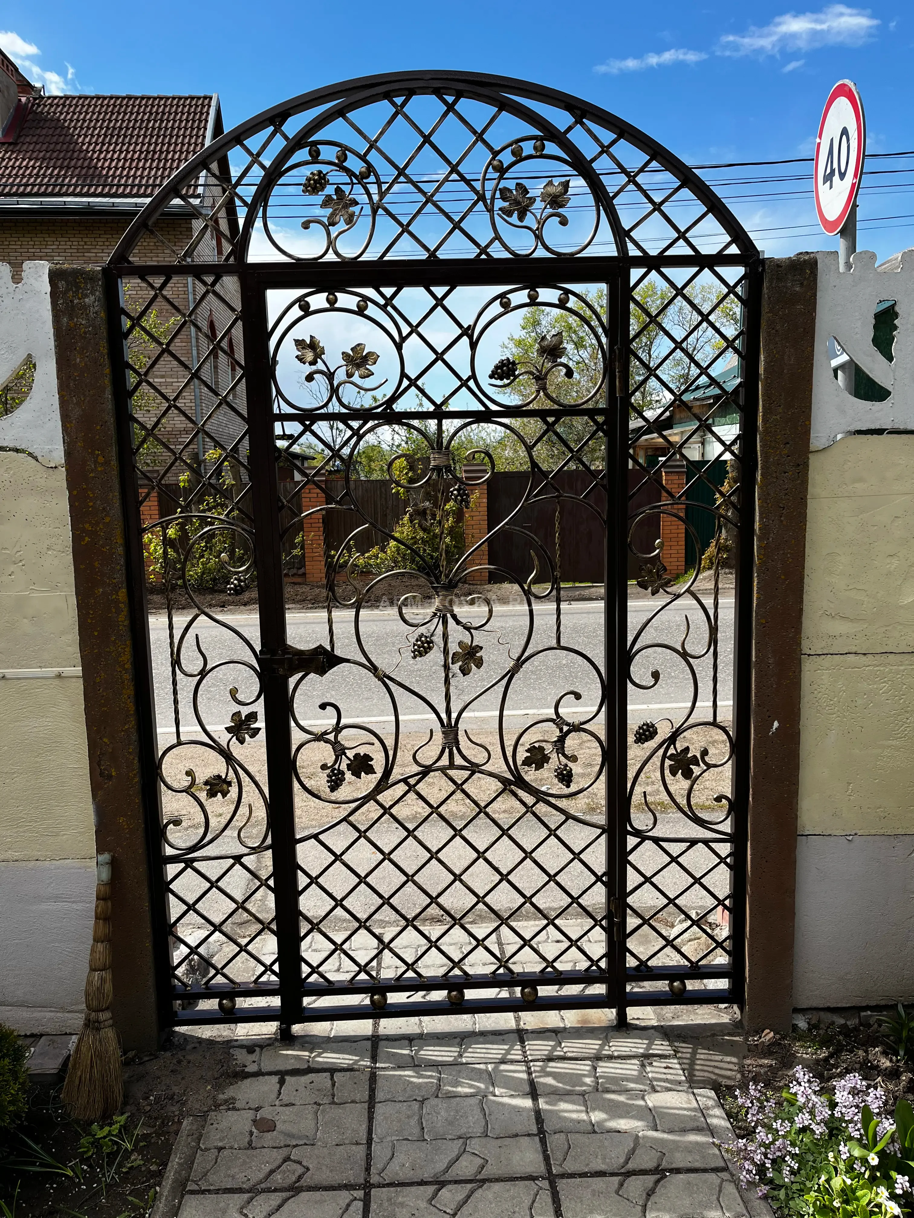 Воздушная и изящная кованая калитка сквозного типа, выполненная в художественном стиле с обилием растительных мотивов. Конструкция представляет собой ажурное металлическое полотно, окрашенное в классический темно-коричневый цвет с золотистым патинированием декоративных элементов. Центральную композицию калитки занимает симметричный узор из витых стеблей, украшенных коваными виноградными листьями и реалистичными гроздьями ягод. Верхняя и нижняя части изделия, а также высокая арочная фрамуга заполнены решеткой-ромбом, которая создает геометрический контраст с мягкими линиями лозы. Боковые стационарные секции повторяют общий дизайн, визуально расширяя входную группу и объединяя её в единый архитектурный ансамбль. Калитка установлена в проем бетонного ограждения, открывая вид на улицу и обеспечивая хорошую освещенность придомовой территории. Данная модель идеально подходит для загородных домов, владельцы которых ценят эстетику классической ковки и стремятся создать гостеприимную атмосферу. Изделие спроектировано для профессиональной установки и интеграции в проекты ландшафтного дизайна.