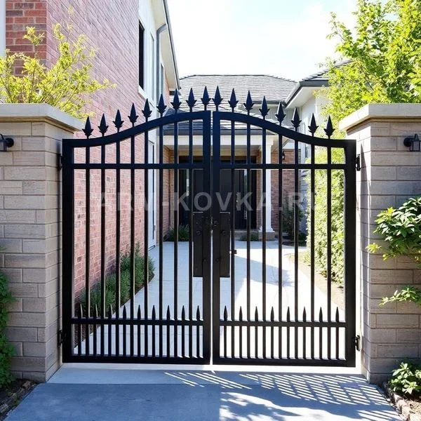 Величественные двухстворчатые ворота сквозного типа, сочетающие в себе классическую строгость и надежную защиту. Конструкция выполнена из высокопрочного металлического профиля с глубоким черным матовым покрытием, устойчивым к атмосферным воздействиям. Дизайн изделия отличается выразительной геометрией: верхний край створок образует плавную восходящую арку, увенчанную рядом крупных литых пик. Особенностью данной модели является наличие второго защитного ряда из более мелких пик в нижней части полотна, что придает конструкции дополнительную жесткость и завершенный вид. Вертикальное заполнение из параллельных прутьев обеспечивает отличный обзор территории, сохраняя при этом ощущение приватности. Ворота установлены в проем между массивными столбами из светлого декоративного кирпича, создавая классический контраст с архитектурой дома. Изделие укомплектовано массивными центральными ручками и надежной системой петель, идеально подходя для оформления парадного въезда в частную резиденцию. Данная работа является примером качественного благоустройства и долговечности в металле.