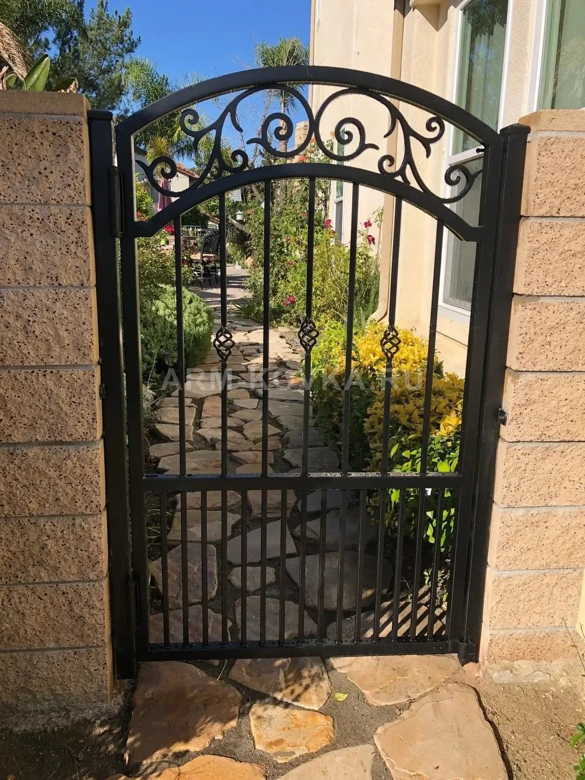 Изящная кованая калитка сквозного типа, выполненная в классическом стиле, идеально подходит для зонирования садового пространства или оформления входа во внутренний дворик. Конструкция изготовлена из металла с качественным черным матовым покрытием, обеспечивающим долговечность и эстетичный вид. Верхняя часть изделия оформлена в виде высокой арочной фрамуги, украшенной художественной ковкой с симметричными завитками и волютами. Основное полотно калитки заполнено вертикальными прутьями, центральные из которых дополнены декоративными элементами в виде объемных «корзинок» (фонариков). Нижний пояс калитки имеет более частое вертикальное заполнение, что придает конструкции дополнительную прочность. Изделие установлено в проем между столбами из фактурного декоративного камня песочного цвета, открывая вид на мощеную натуральным камнем садовую дорожку. Данная модель является прекрасным примером гармонии функциональности и декоративного искусства в рамках проектов по благоустройству территорий.