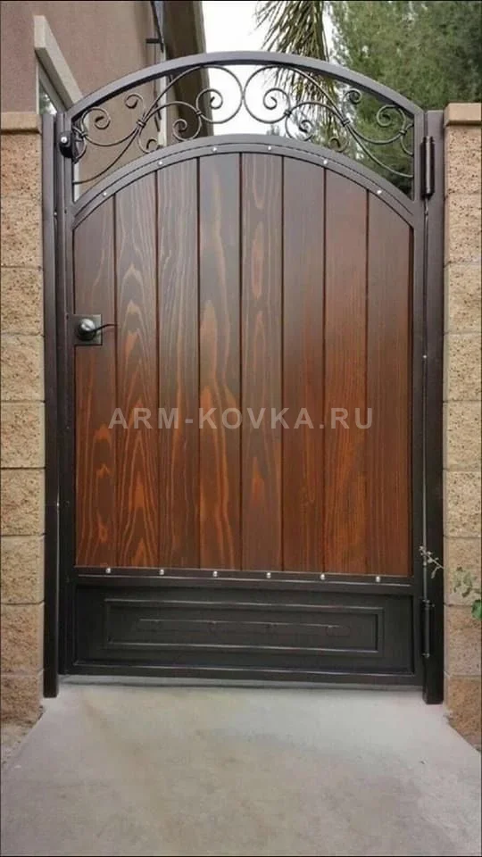 Изысканная калитка закрытого типа, представляющая собой гармоничное сочетание художественной ковки и натуральной фактуры дерева. Центральное полотно выполнено из вертикально ориентированных деревянных панелей с выраженным природным рисунком, покрытых защитным составом глубокого коричневого оттенка. Такая конструкция обеспечивает полную приватность и придает входной группе особый уют. Каркас и декоративные элементы изготовлены из металла с темно-бронзовым матовым покрытием. Нижняя часть изделия усилена глухим филенчатым цоколем, защищающим дерево от влаги и дорожной пыли. Верхняя часть калитки оформлена в виде высокой арочной фрамуги, заполненной изящными коваными завитками и волютами, что придает массивной конструкции визуальную легкость. Калитка установлена в проем между столбами из фактурного декоративного камня песочного цвета. Модель укомплектована надежной фурнитурой — массивной нажимной ручкой и врезным замком, идеально подходя для оформления парадного входа в загородную резиденцию в стиле кантри или шале. Данное изделие разработано в рамках профессиональных решений по благоустройству территорий.