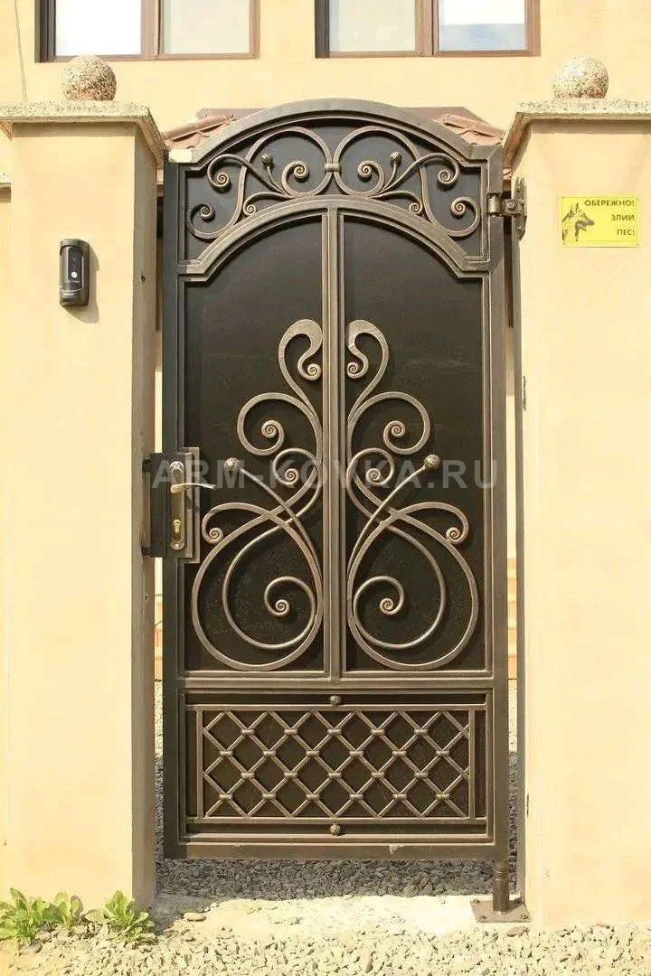 Роскошная кованая калитка закрытого типа, выполненная в классическом стиле с элементами барокко. Полотно изделия закрыто сплошным металлическим листом, окрашенным в темный матовый цвет, что обеспечивает полную приватность и служит идеальным фоном для накладного декора. Основной каркас и кованые элементы покрыты благородной бронзовой патиной. Центральную часть композиции занимает изящный симметричный узор из крупных волют и завитков, напоминающий стилизованное древо. Верхняя часть калитки оформлена в виде сложной арочной фрамуги с дополнительным ажурным орнаментом. Нижняя секция (цоколь) выделена прямоугольной вставкой с диагональной решеткой-сеткой, придающей конструкции визуальную устойчивость. Калитка установлена в проем между оштукатуренными столбами песочного цвета, гармонируя с архитектурой современного загородного дома. Модель оснащена надежной фурнитурой золотистого цвета — эргономичной ручкой и качественным замком. Это премиальное решение для тех, кто ищет сочетание безопасности и высокой художественной ценности в благоустройстве своего участка. Данная работа выполнена в рамках профессиональных проектов по металлообработке.
