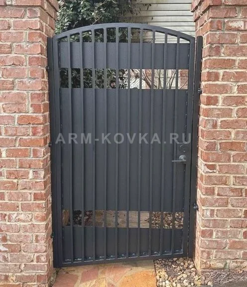 Современная кованая калитка комбинированного типа, сочетающая в себе индустриальную строгость и функциональность. Конструкция изготовлена из металла с глубоким черным матовым покрытием. Дизайн модели базируется на чередовании глухих металлических панелей и открытых участков с вертикальными прутьями, что создает уникальный графичный ритм. Верхняя часть калитки имеет плавную арочную форму, которая смягчает строгую геометрию изделия. Полотно разделено на несколько горизонтальных зон: широкая центральная панель обеспечивает приватность, в то время как узкие сквозные прорези сверху и снизу придают конструкции визуальную легкость и обеспечивают обзор. Калитка установлена в проем из классического красного кирпича, подчеркивающего современный минималистичный стиль изделия. Модель оснащена надежной врезной ручкой и замком, идеально подходя для благоустройства территорий в стиле лофт или хай-тек. Данное решение представляет собой образец качественной металлообработки, ориентированной на долговечность и актуальный дизайн.