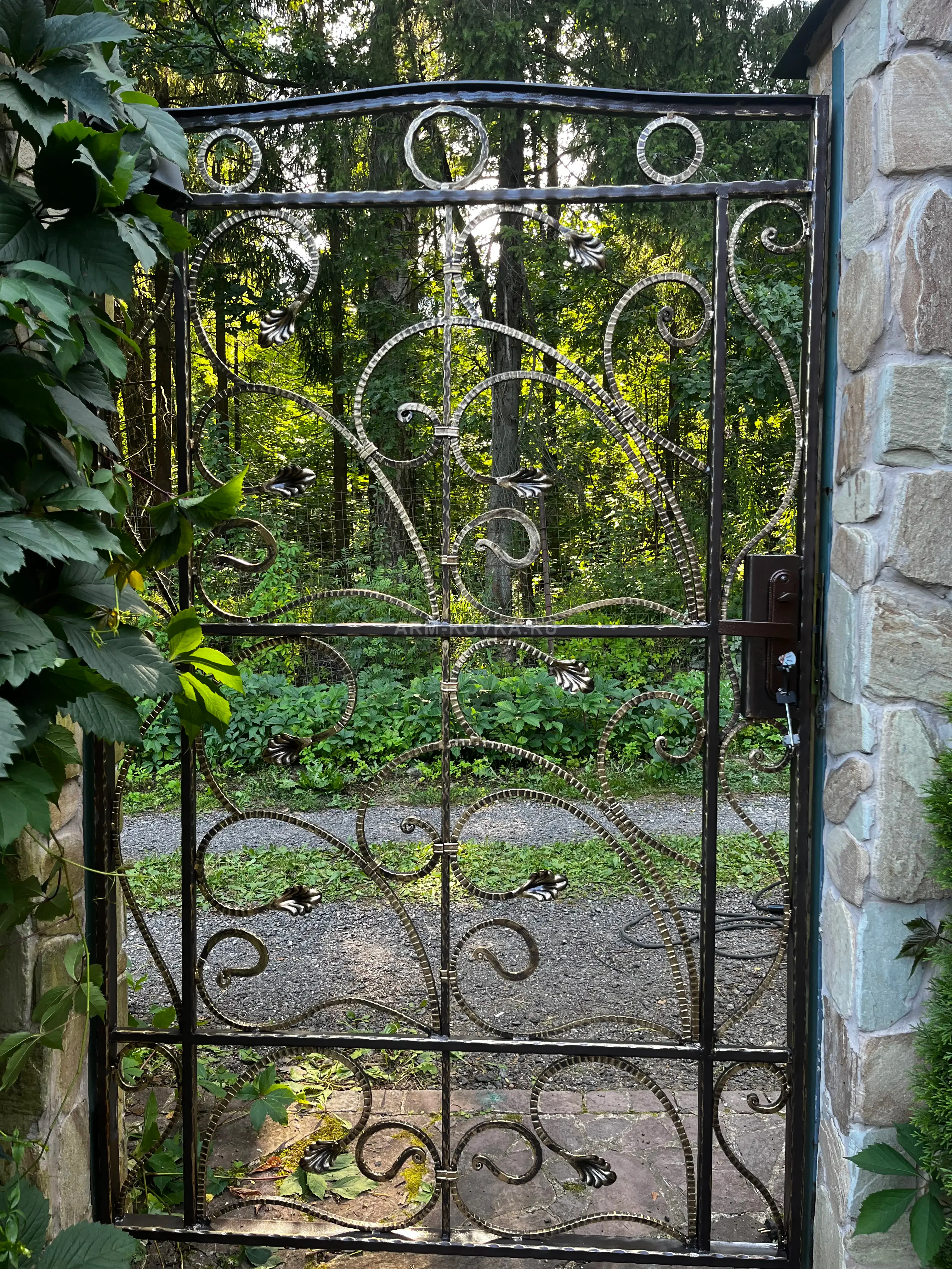 Изящная кованая калитка сквозного типа, представляющая собой высокохудожественное изделие из металла с эффектом благородного старения. Конструкция выполнена в классическом стиле с акцентом на природные мотивы. Основной каркас калитки имеет прямоугольную форму с легким арочным изгибом в верхней части, подчеркнутым декоративными кольцами. Внутреннее заполнение полотна представляет собой сложную симметричную композицию из витых кованых прутьев, плавно переходящих в волюты и завитки. Особую эстетическую ценность модели придают многочисленные кованые листья, акцентированные золотой патиной, которая эффектно выделяется на фоне темного основного покрытия. Изделие установлено в проем из натурального фактурного камня, органично вписываясь в ландшафт лесного или садового участка. Калитка оснащена надежным врезным замком с массивной ручкой, обеспечивая безопасность и удобство эксплуатации. Данная модель разработана в рамках профессиональных решений по благоустройству территорий для создания неповторимого облика загородной резиденции.