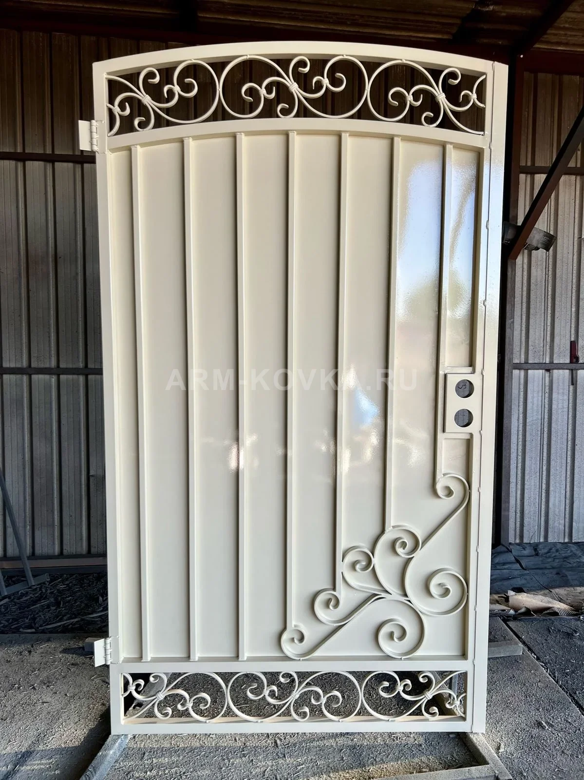 Элегантная кованая калитка закрытого типа, отличающаяся редким для металлических изделий цветом «слоновая кость» с глянцевым блеском. Основное полотно выполнено из сплошного металлического листа, усиленного вертикальными ребрами жесткости, что гарантирует высокую прочность и полную приватность территории. Данная модель разработана в рамках профессиональных проектов по металлообработке и благоустройству. Художественное оформление калитки включает симметричные ажурные пояса в верхней фрамуге и цокольной части, заполненные изящными коваными завитками и волютами. Дополнительным акцентом служит угловая накладная композиция из плавных кованых элементов, расположенная в нижней правой части полотна. Верхний край изделия имеет классическую арочную форму. Калитка оснащена подготовленным местом под установку врезного замка и ручки, представляя собой идеальное сочетание надежной защиты и эстетики легкого прованса для оформления входной группы загородного дома.