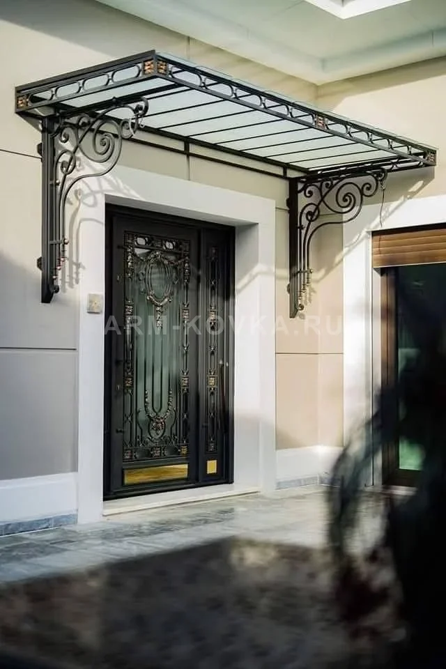 Премиальный односкатный козырек, выполненный в строгом классическом стиле с элементами неоклассики. Конструкция выделяется массивной прямоугольной рамой, торцы которой украшены орнаментом из повторяющихся колец и золотистых декоративных вставок. Особое внимание уделено несущим кронштейнам: они имеют сложную форму с крупными волютами и вертикальными коваными прутьями, имитирующими балясины. В качестве кровельного покрытия использовано ударопрочное стекло (или монолитный поликарбонат) с четкой раскладкой ребер жесткости, что придает конструкции современный и легкий вид. Черное матовое покрытие металла с точечным золотым патинированием идеально гармонирует с богатым декором входной двери, создавая статусную и завершенную входную группу.