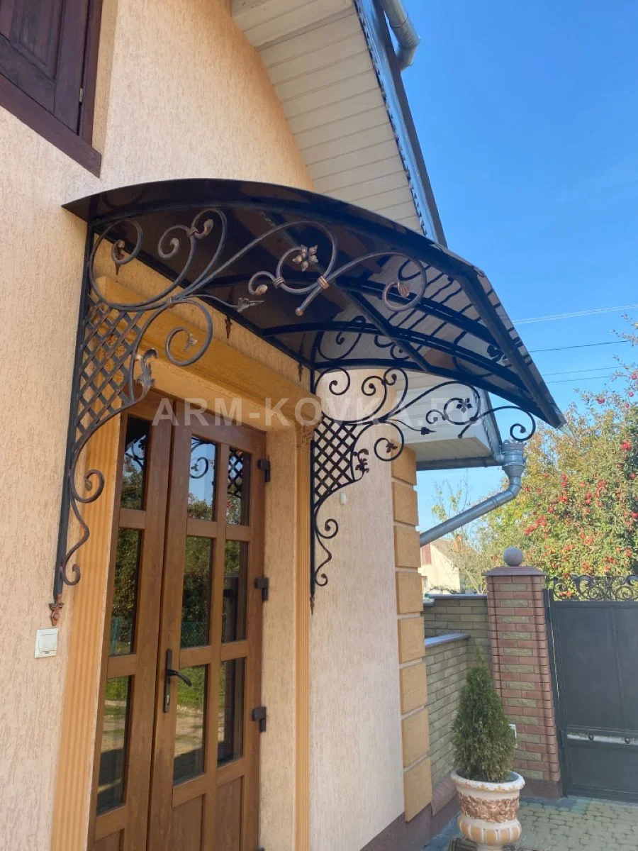 Элегантный арочный козырек, сочетающий геометрическую строгость и изящные флористические элементы. Главной особенностью модели являются мощные боковые кронштейны с наполнением в виде диагональной решетки, дополненные коваными цветами и листьями. Фронтон украшен симметричным узором из волют, в центре которого также расположен декоративный кованый цветок. Каркас окрашен в темный цвет с медным патинированием, что придает изделию антикварный вид и гармонирует с цветом деревянной входной двери. Кровля из темного поликарбоната надежно защищает порог от осадков, создавая уютную и защищенную входную зону.