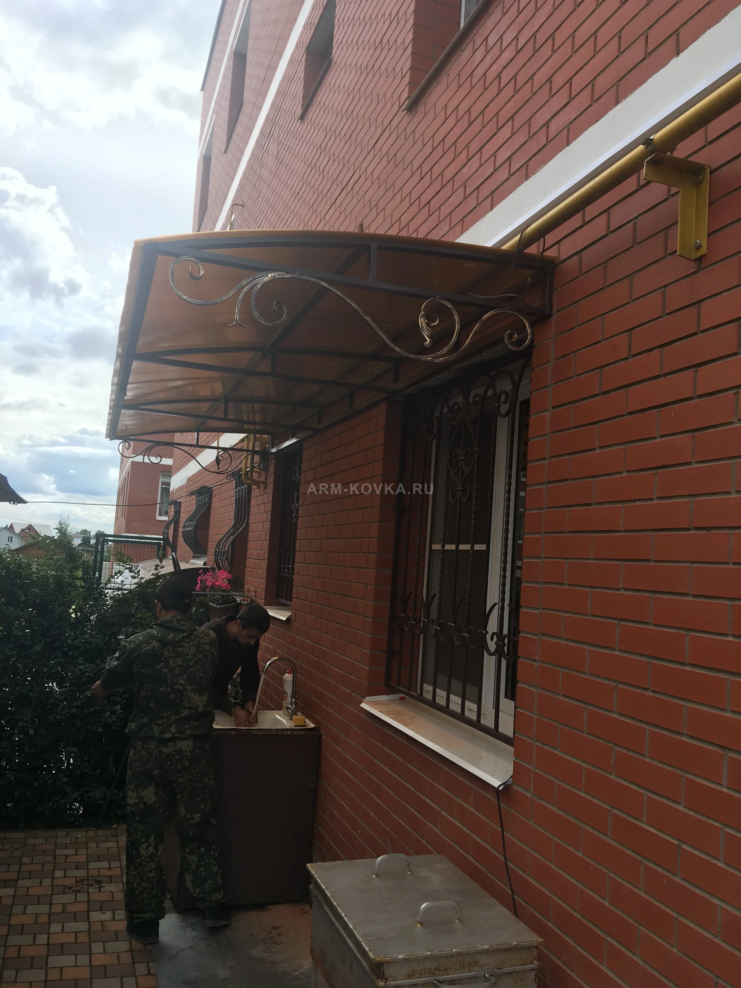 Практичный односкатный козырек, установленный над хозяйственной зоной. Боковой фриз украшен изящным кованым узором из вытянутых S-образных волют с декоративными перехватами, что придает легкость металлической конструкции. Каркас выполнен из профильной трубы и окрашен в темно-коричневый цвет, гармонирующий с цветом кирпичной кладки. Кровля из золотистого (бронзового) поликарбоната обеспечивает надежную защиту от осадков, пропуская при этом достаточное количество света. Конструкция крепится непосредственно к фасаду здания, обеспечивая комфорт в зоне мойки или дополнительного входа.