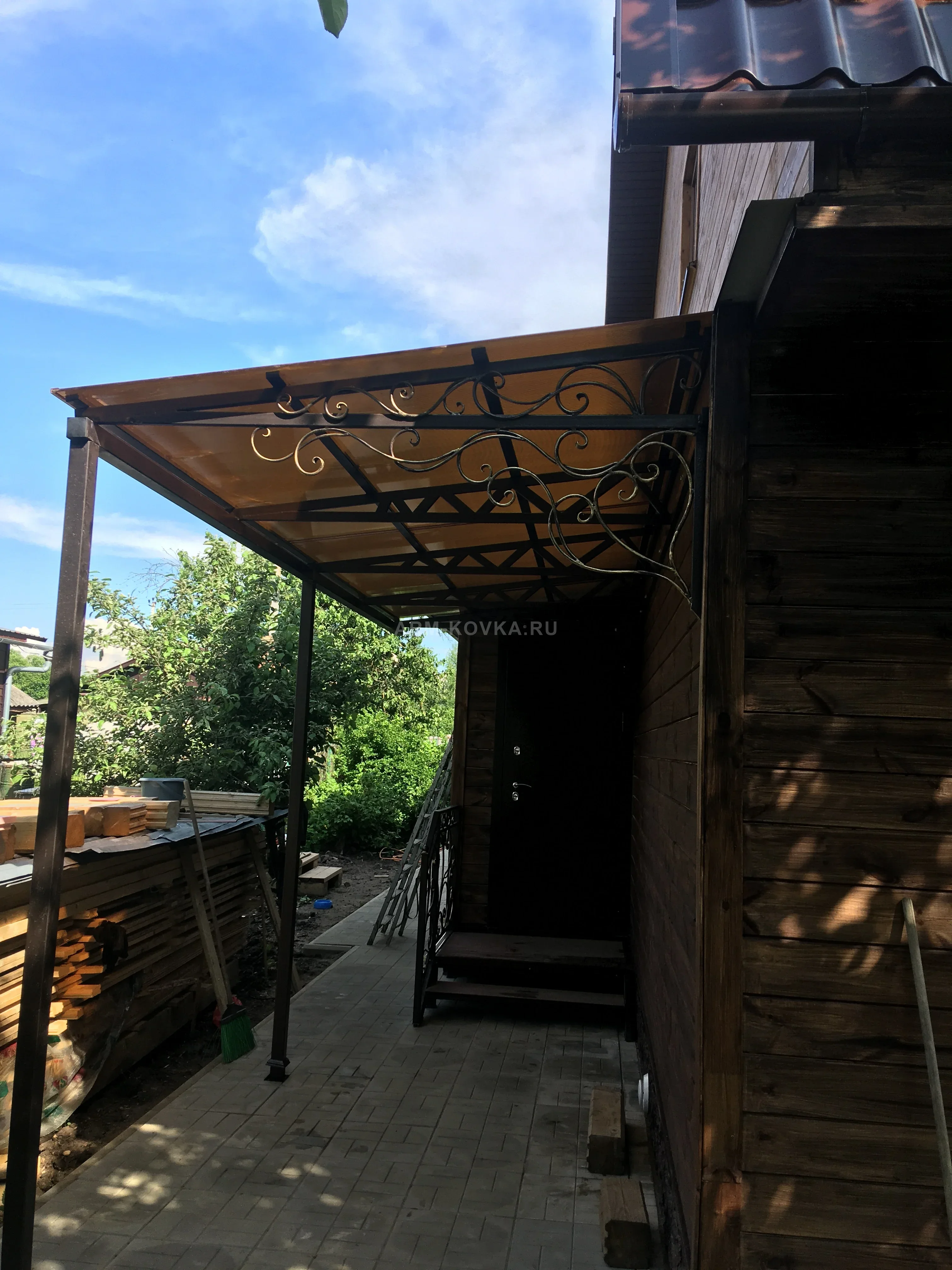 Просторный односкатный навес, предназначенный для защиты длинного крыльца или террасы. Главным украшением служит боковой кованый фриз, заполненный изящными S-образными завитками и переплетающимися волютами с золотистым напылением. Конструкция усилена ферменной структурой из профильной трубы, что обеспечивает устойчивость к снеговым нагрузкам. Внешний край опирается на устойчивые металлические стойки, окрашенные в тон фасада. Кровля из сотового поликарбоната цвета «бронза» отлично сочетается с отделкой дома из темного дерева, создавая гармоничный и защищенный проход вдоль стены.