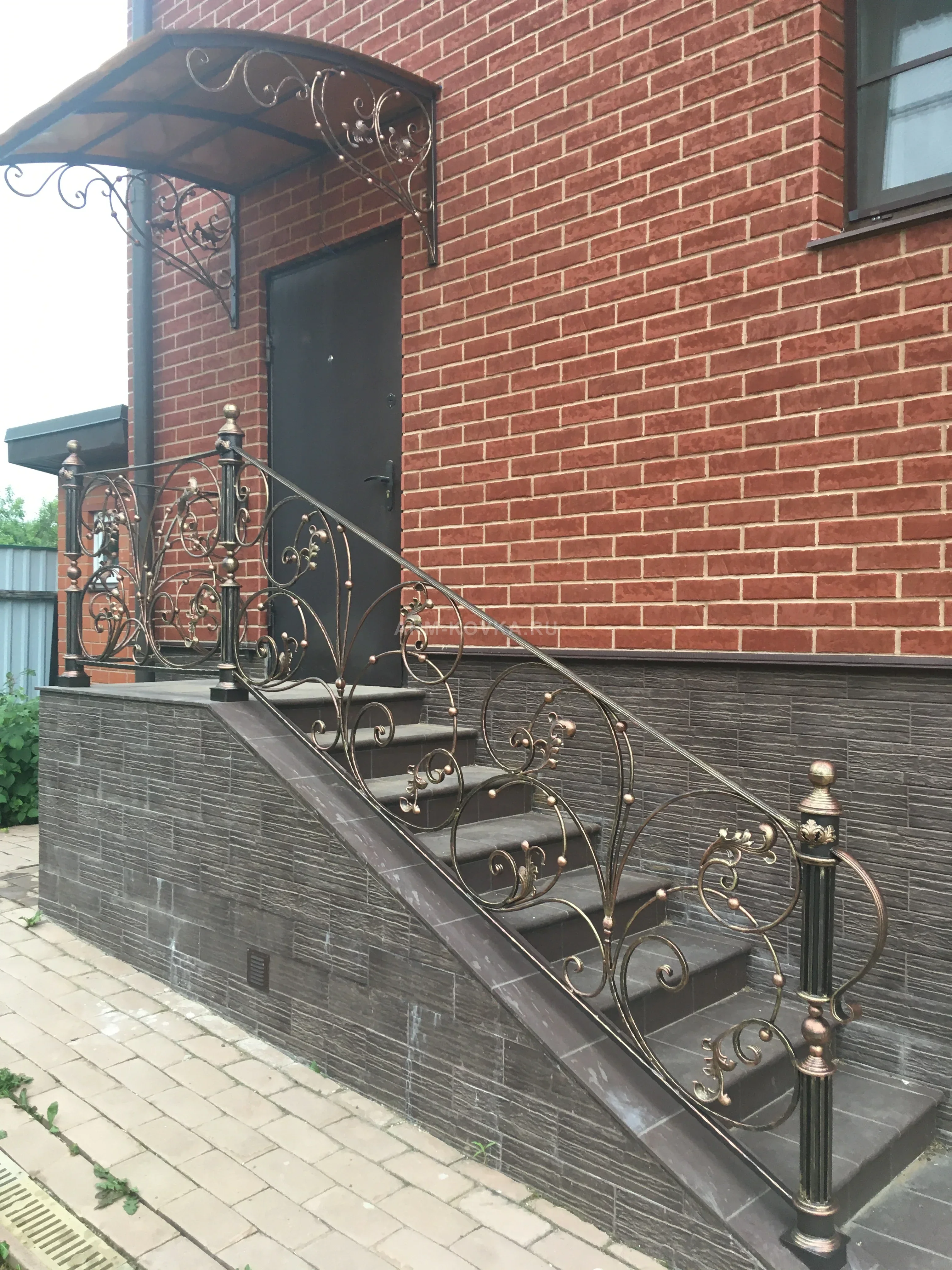 Элегантный комплект для оформления высокого крыльца, выполненный в едином художественном стиле. Арочный козырек опирается на изящные кронштейны с плотным заполнением из завитков и кованых шаров. Особое внимание привлекают перила: они украшены сложным флористическим орнаментом, включающим волюты, имитацию бутонов и декоративные вставки на балясинах. Стойки перил имеют массивные навершия и основания, что придает лестнице парадный вид. Темная краска с бронзовым патинированием подчеркивает объем кованых элементов и отлично гармонирует с облицовкой фасада под кирпич и камень.