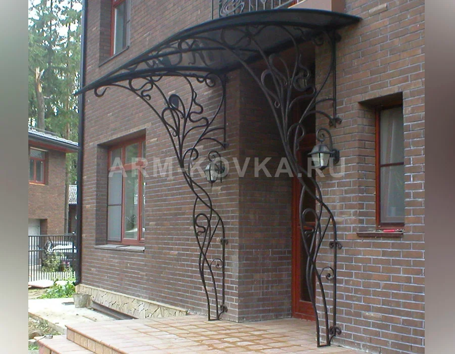 Эксклюзивная модель, представляющая собой настоящий шедевр художественной ковки. Главная особенность конструкции — уникальные боковые опоры, выполненные в виде переплетающихся ветвей дерева или стеблей лиан, которые плавно переходят в каркас навеса. Асимметричный и сложный узор из кованых линий создает эффект природной органики, идеально дополняя фасады из темного кирпича. Глубокий вынос арки и темное тонированное покрытие обеспечивают надежную защиту парадного входа, а изящные уличные фонари в классическом стиле завершают общую композицию. Такая модель станет центральным декоративным элементом любого загородного особняка.