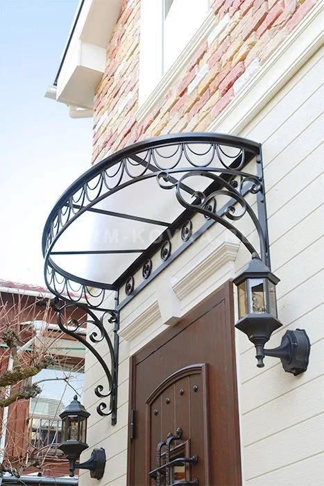Элегантный козырек арочного типа с лаконичным, но выразительным кованым декором. Торцевая часть каркаса украшена повторяющимся узором из изящных дуг, а кронштейны дополнены классическими волютами, обеспечивающими жесткость конструкции. Кровля выполнена из светлого матового поликарбоната, который мягко рассеивает свет, защищая входную зону от осадков и ультрафиолета. Черный матовый цвет металла создает строгий и аккуратный контраст со светлым фасадом дома. На фото козырек представлен в сочетании с настенными уличными фонарями и кованой фурнитурой двери, что подчеркивает единство стиля оформления входной группы.