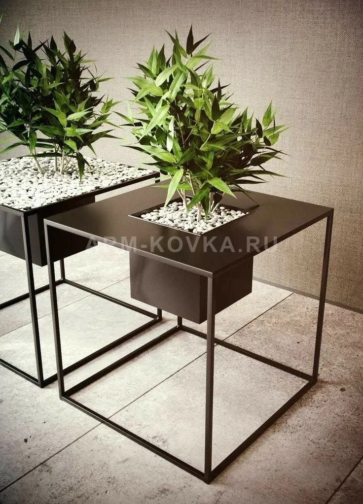 Ультрасовременное решение для озеленения интерьера и экстерьера, сочетающее в себе строгость геометрических форм и функциональность мебели. Модель «Куб-Инфинити» идеально подходит для ландшафтного дизайна загородных участков, входных групп бизнес-центров или террас в Истринском районе. Благодаря лаконичному дизайну, эта цветочница не просто удерживает растение, а создает вокруг него законченную архитектурную композицию. Основой конструкции служит легкий, но прочный каркас из стального профиля квадратного сечения, образующий идеальный куб. В верхнюю плоскость интегрирована глубокая металлическая чаша-кашпо, которая словно парит в воздухе, удерживаемая невидимыми креплениями. Широкие поля верхней панели позволяют использовать изделие как кофейный столик или подставку для аксессуаров. Такая конструкция обеспечивает отличную вентиляцию корневой системы растений и удобство при декорировании поверхности (например, белой галькой, как на фото). Изделие полностью покрыто атмосферостойкой порошковой краской с глубокой матовой текстурой цвета «антрацит». Покрытие надежно защищает металл от коррозии, воздействия ультрафиолета и влаги, что позволяет использовать цветочницу на открытом воздухе круглый год. «Куб-Инфинити» — это безупречный выбор для тех, кто ищет способ гармонично вписать живую природу в индустриальный или минималистичный дизайн.
