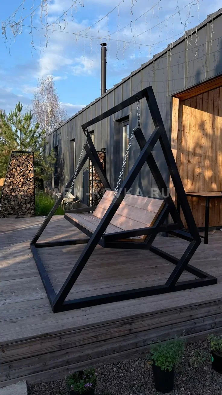 Футуристичные садовые качели, представляющие собой идеальный баланс индустриальной архитектуры и загородного комфорта. Модель «A-Frame LOFT» разработана специально для современных ландшафтов Истринского района, где преобладают строгие линии и дома в стиле барнхаус или минимализм. Эти качели станут не только любимым местом отдыха, но и главным арт-объектом вашей террасы или зоны патио. Несущий каркас выполнен из мощного стального профиля большого сечения, что обеспечивает конструкции исключительную устойчивость и способность выдерживать высокие нагрузки без раскачивания основания. Дизайн рамы в виде пересекающихся треугольников создает сложный геометрический силуэт, который выглядит по-разному с каждого ракурса. Подвесное сиденье закреплено на надежных стальных цепях, обеспечивающих плавный ход. Скамья выполнена из широких ламелей натурального дерева, обработанных защитными составами для сохранения текстуры и защиты от осадков. Металл защищен от коррозии многослойным полимерным покрытием глубокого черного цвета. Сочетание грубой стальной рамы и теплого оттенка дерева подчеркивает аутентичность стиля лофт. Качели «A-Frame LOFT» — это бескомпромиссная надежность и смелый дизайн для ценителей современного комфорта на свежем воздухе.