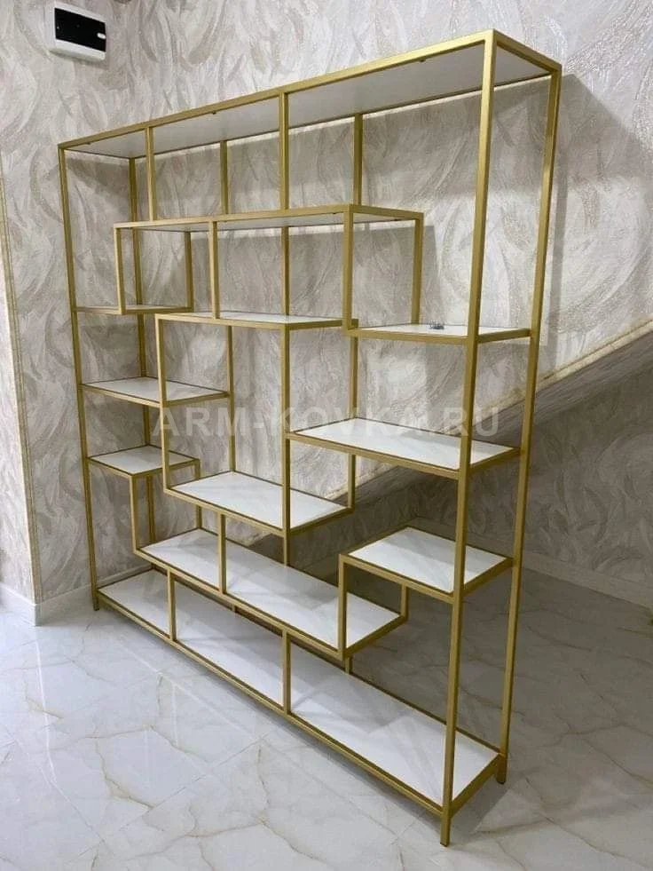 Изысканный и графичный стеллаж, который объединяет в себе функциональность системы хранения и легкость декоративной перегородки. Модель «Золотой Лабиринт» — это воплощение современного стиля Neo-Loft, созданное для тех, кто хочет добавить в интерьер своего дома в Истринском районе благородный блеск металла и безупречную геометрию линий. Каркас изделия представляет собой сложную цельносварную конструкцию из тонкого стального профиля. Уникальный асимметричный рисунок ячеек разного размера создает эффектную визуальную игру, напоминающую лабиринт или абстрактное полотно. Полки выполнены из белоснежного глянцевого материала, который в сочетании с золотым каркасом наполняет помещение светом и ощущением чистоты. Благодаря открытому дизайну и отсутствию задней стенки, стеллаж идеально подходит для зонирования пространства, разделяя комнату на функциональные части без потери визуального объема. Металл окрашен высококачественной порошковой краской с эффектом «матовое золото», которая обладает повышенной износостойкостью и приятной на ощупь фактурой. Компактная глубина стеллажа позволяет установить его даже в небольших помещениях, сохраняя эргономику пространства. Стеллаж «Золотой Лабиринт» — это идеальный баланс между индустриальной строгостью и интерьерным шиком, превращающий хранение вещей в настоящее искусство.