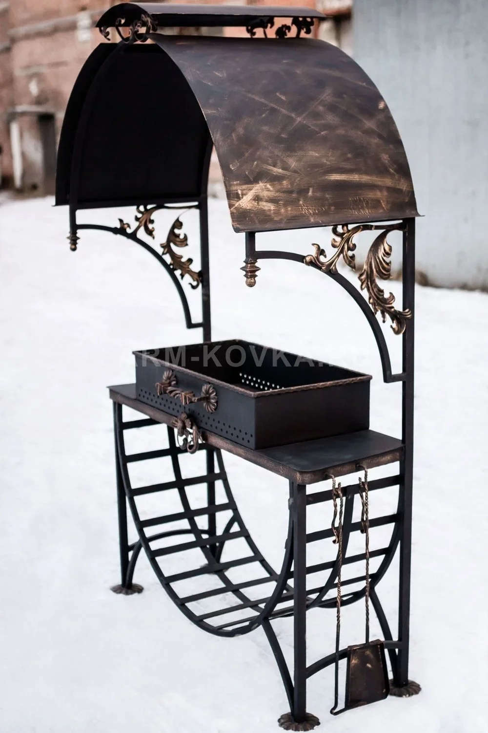 Компактный и эстетичный мангальный комплекс, представляющий собой образец высококачественной металлообработки с элементами ручной художественной ковки. Модель спроектирована как функциональное украшение зоны барбекю, сочетающее надежность стального каркаса с изящным классическим декором. Изделие идеально подходит для ценителей эксклюзивных решений на загородных участках в Истринском районе. Архитектурной особенностью мангала является глубокая полусферическая крыша, установленная на ажурных кованых кронштейнах с литыми растительными орнаментами. Жаровня выполнена из толстостенного металла и украшена коваными ручками и декоративными розетками. Основание конструкции представляет собой устойчивую радиусную дровницу реечного типа, которая обеспечивает удобный доступ к топливу и придает изделию визуальную легкость. В комплект входят подвесные кованые аксессуары — совок и кочерга с витыми рукоятками. Металл покрыт премиальным термостойким составом с эффектом бронзовой патины, подчеркивающим фактуру кованых элементов и защищающим конструкцию от коррозии и высоких температур. Этот мангал обеспечит максимальный комфорт в эксплуатации и станет статусным дополнением вашего экстерьера.