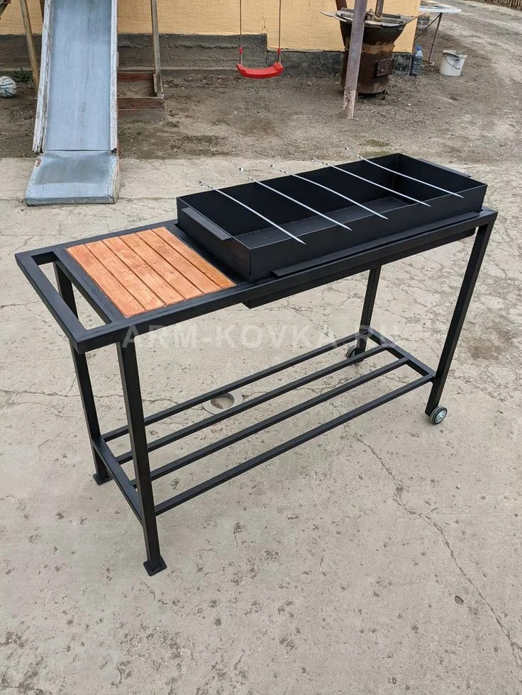 Лаконичный и функциональный мангал, выполненный в строгом индустриальном стиле Loft. Эта модель создана для тех, кто предпочитает минимализм, чистоту линий и высокую эргономику в организации зоны барбекю. Данное изделие является результатом качественной металлообработки, где основной акцент сделан на надежность конструкции и удобство повседневной эксплуатации. Основой мангала служит прочный сварной каркас из стального профиля квадратного сечения, обеспечивающий исключительную жесткость и устойчивость. Особенностью модели является её мобильность: с одной стороны конструкция оснащена парой надежных колес, а с другой — удобной ручкой-поручнем, что позволяет легко перемещать мангал по любой ровной поверхности. Слева от жаровни расположена вспомогательная рабочая поверхность с настилом из натурального дерева светлых тонов, идеально подходящая для подготовки продуктов. В нижней части предусмотрена открытая реечная полка для хранения дров или кухонного инвентаря. Металл покрыт матовой термостойкой краской черного цвета, которая защищает изделие от коррозии и температурных воздействий. Благодаря современному дизайну, мангал станет стильным дополнением к любому загородному участку, обеспечивая комфортный процесс приготовления любимых блюд.