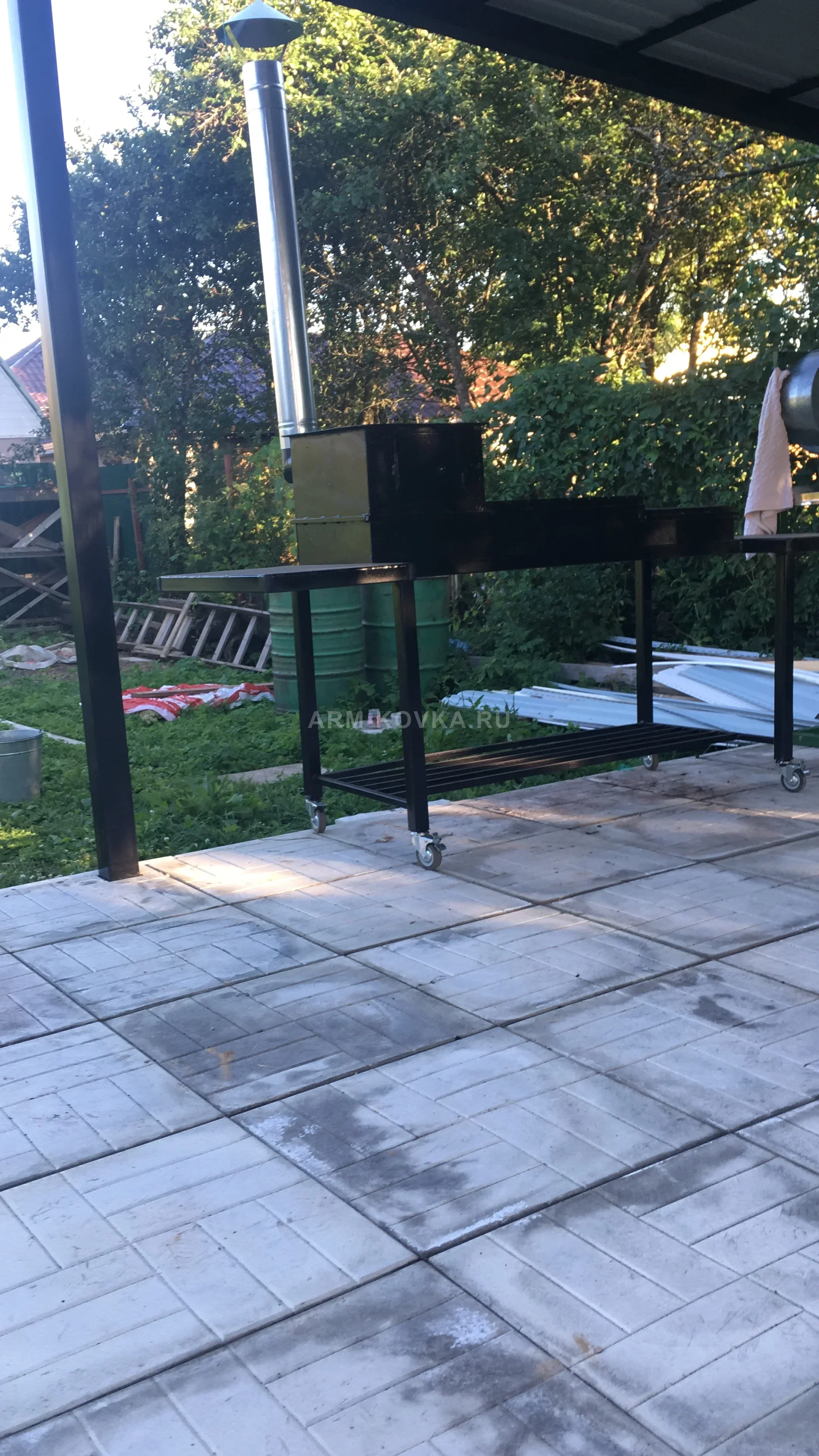 Массивный и функциональный мангальный комплекс, выполненный в строгом индустриальном стиле, идеально подходящий для капитального обустройства зоны барбекю. Эта модель ориентирована на профессиональное приготовление широкого спектра блюд на открытом огне, обеспечивая высокую надежность и удобство управления тепловыми потоками. Изделие является результатом качественной металлообработки, сочетающей в себе долговечность стальных конструкций и эргономичный дизайн. Основой комплекса служит усиленный сварной каркас из стального профиля, обеспечивающий исключительную устойчивость конструкции. Для обеспечения мобильности на ровных поверхностях станина оснащена полноповоротными колесами с тормозными фиксаторами. Рабочая зона разделена на два функциональных модуля: классическую глубокую жаровню и закрытую печь для казана, снабженную высоким стальным дымоходом с защитным зонтом для эффективного отвода продуктов горения. Вдоль всего комплекса предусмотрены вспомогательные полки для инвентаря, а в нижней части расположена вместительная реечная дровница. Металлические поверхности защищены износостойким термостойким покрытием черного цвета, устойчивым к коррозии и экстремальным температурам. Благодаря своей функциональности, этот комплекс станет надежной основой для вашей летней кухни в Истринском районе.