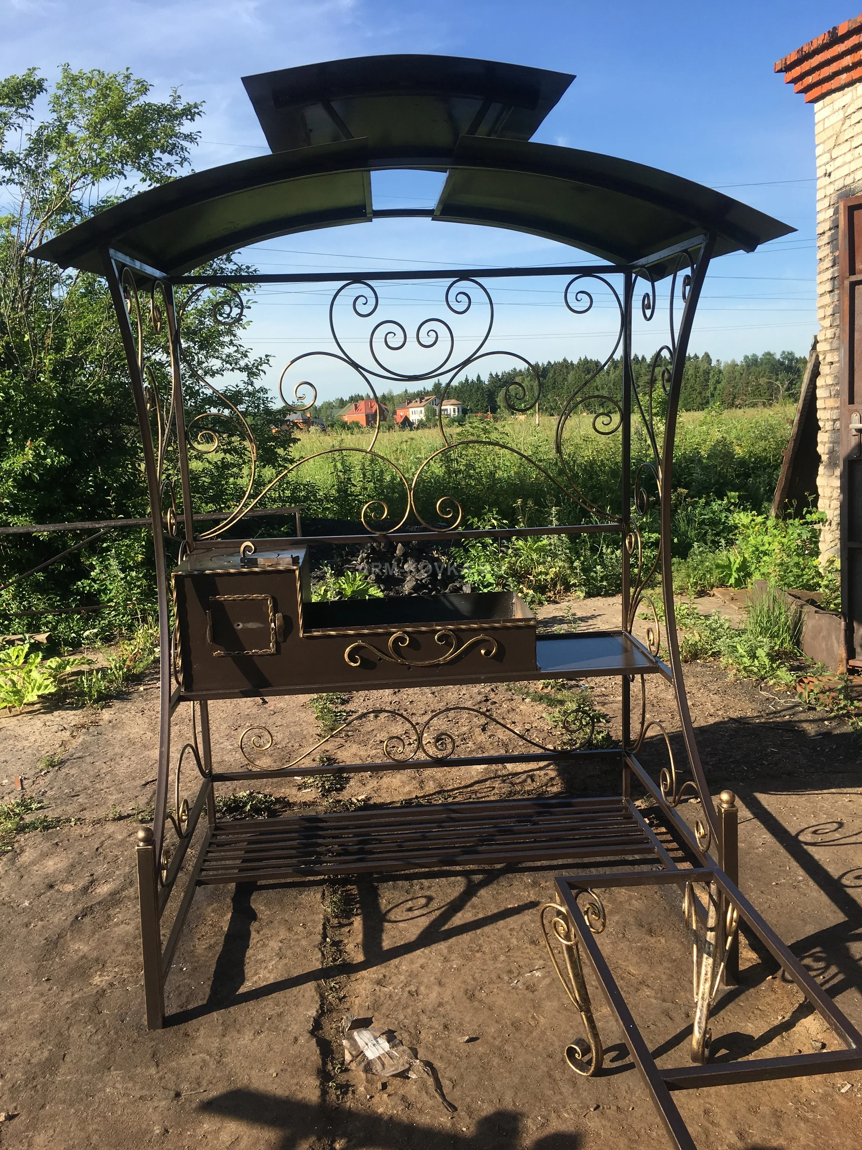 Многофункциональный стационарный комплекс, представляющий собой полноценное рабочее место для кулинарии на открытом воздухе. Данная модель объединяет в себе изящество художественной ковки и высокую практичность, обеспечивая все условия для приготовления разнообразных блюд на огне под надежной защитой от осадков. Изделие является результатом качественной металлообработки, ориентированной на долговечную службу и эстетическое преображение загородного участка. Конструкция базируется на массивном стальном каркасе, увенчанном широкой двухъярусной арочной крышей с вентиляционным зазором для эффективного отвода дыма. Задняя и боковые панели украшены ажурными коваными завитками и волютами, которые не только придают легкость архитектурному облику, но и служат дополнительными ребрами жесткости. Рабочая зона включает в себя комбинированный модуль: глубокую жаровню и встроенную печь для казана с чугунной плитой. По обе стороны от жаровни предусмотрены удобные вспомогательные полки, а в нижней части расположена вместительная реечная дровница. Металлические поверхности покрыты термостойким составом коричневого оттенка и декорированы ручной золотой патиной, подчеркивающей объем кованых элементов. Такой комплекс станет идеальным решением для благоустройства территории частного дома в Истринском районе.