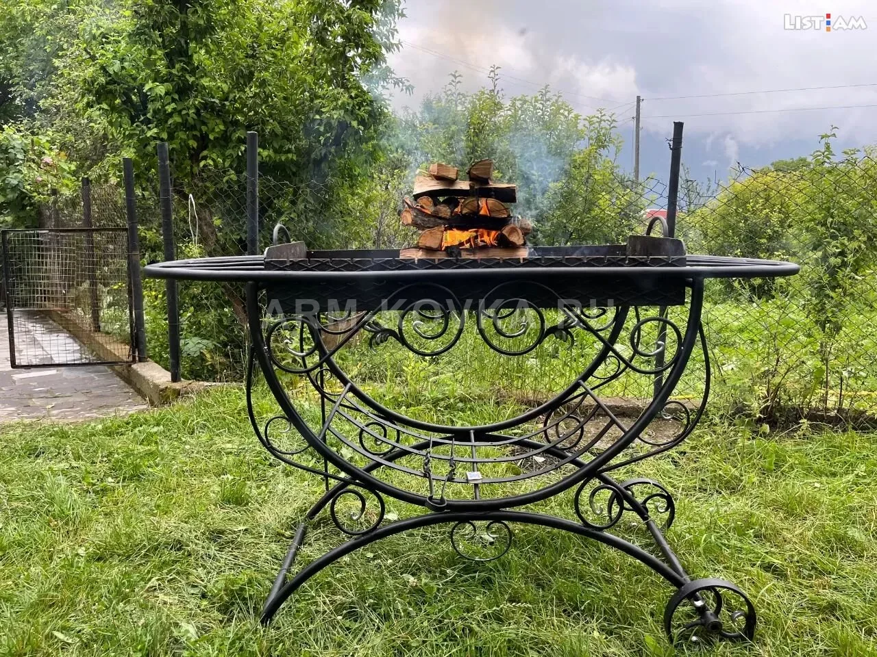 Оригинальный мобильный мангал, сочетающий в себе легкость кованых линий и высокую функциональность. Модель выделяется необычной геометрией каркаса, которая превращает утилитарный предмет в изысканный элемент садового ландшафта. Данное изделие является результатом качественной металлообработки, созданным для тех, кто ищет нестандартные и практичные решения для загородного отдыха. Конструктивной особенностью модели является круговой кованый поручень, опоясывающий жаровню, который служит не только декоративным элементом, но и удобной подставкой для аксессуаров. Станина выполнена в виде двух пересекающихся дуг, украшенных многочисленными волютами и завитками, что придает конструкции визуальную воздушность. Нижняя часть основания образует глубокую радиусную дровницу реечного типа. Для удобства перемещения мангал оснащен парой кованых колес с ажурным рисунком спиц. Глубокая жаровня с декоративной фактурной полосой обеспечивает оптимальный жар для приготовления любимых блюд. Весь комплекс защищен термостойким матовым покрытием черного цвета, устойчивым к коррозии и перепадам температур. Этот мангал станет надежным и стильным центром вашей зоны отдыха.