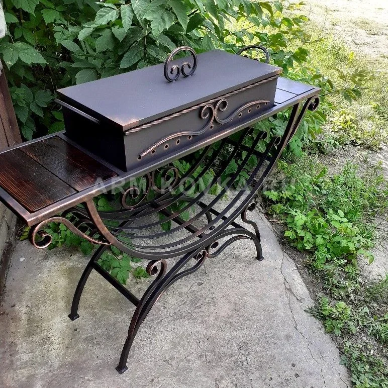 Премиальный кованый мангал, объединяющий в себе художественное изящество и продуманную эргономику. Эта модель спроектирована как функциональное украшение зоны отдыха, сочетающее надежность металлоконструкции с благородным классическим декором. Изделие является результатом мастерской художественной ковки, ориентированной на создание статусных предметов экстерьера. Визуальной доминантой мангала служит элегантное дугообразное основание, которое одновременно выполняет роль вместительной дровницы реечного типа. Каркас украшен сложными коваными завитками и волютами, подчеркивающими легкость конструкции при её высокой устойчивости. Жаровня оснащена плотной съемной крышкой с витой ручкой, что позволяет использовать её для тушения или защиты углей от осадков. По обе стороны от жаровни расположены вспомогательные столики с деревянным настилом из темной древесины, покрытой защитным составом. Весь комплекс обработан качественным термостойким покрытием с эффектом медной патины, которое придает металлу антикварный блеск и защищает его от коррозии. Благодаря своему дизайну и компактным габаритам, мангал станет идеальным дополнением для благоустроенного участка.