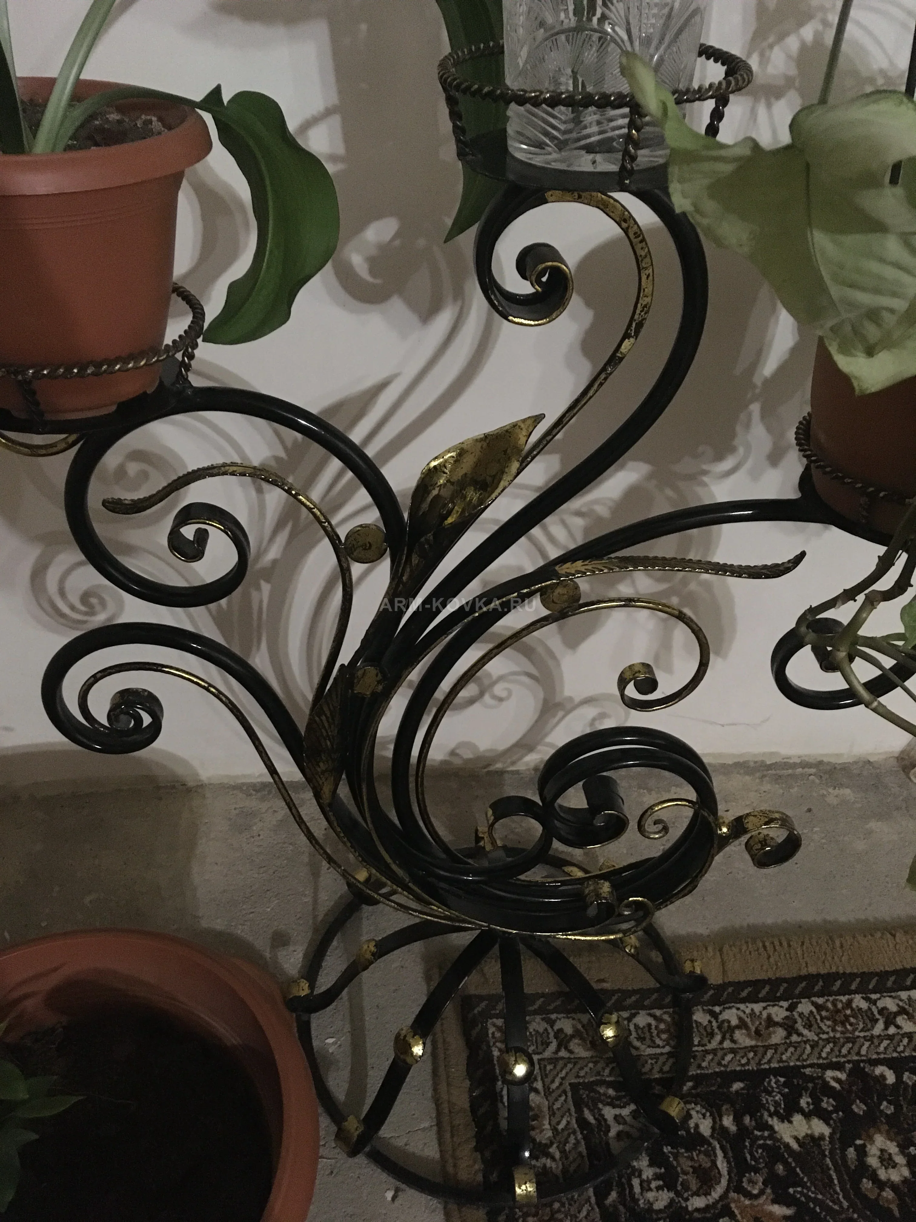 Элегантная и устойчивая многоуровневая подставка, предназначенная для эффектного размещения комнатных растений. Модель «Флора» идеально подходит для благоустройства гостиных, террас или входных групп загородных домов в Истринском районе. Благодаря вертикальной конструкции подставка позволяет создать эффектный «зеленый уголок», занимая при этом минимум полезной площади пола. Художественная композиция изделия имитирует раскидистый куст с изящными S-образными ветвями, выполненными из прочного металлического прута. Подставка оснащена несколькими чашами-держателями с ажурными бортиками из витой проволоки, которые надежно фиксируют цветочные горшки различного диаметра. Декоративные элементы в виде кованых листьев и завитков придают конструкции визуальную легкость и природную гармонию. Массивное куполообразное основание с перекрестными дугами обеспечивает отличную устойчивость даже при полной нагрузке. Металл окрашен в насыщенный черный цвет с контрастным золотым патинированием, выполненным вручную. Позолота выигрышно подчеркивает рельеф кованых листьев, грани завитков и декоративные заклепки на основании, придавая изделию антикварный лоск. Подставка «Флора» — это не просто функциональный предмет, а статусное украшение интерьера, подчеркивающее красоту ваших растений и высокий уровень кузнечного мастерства.