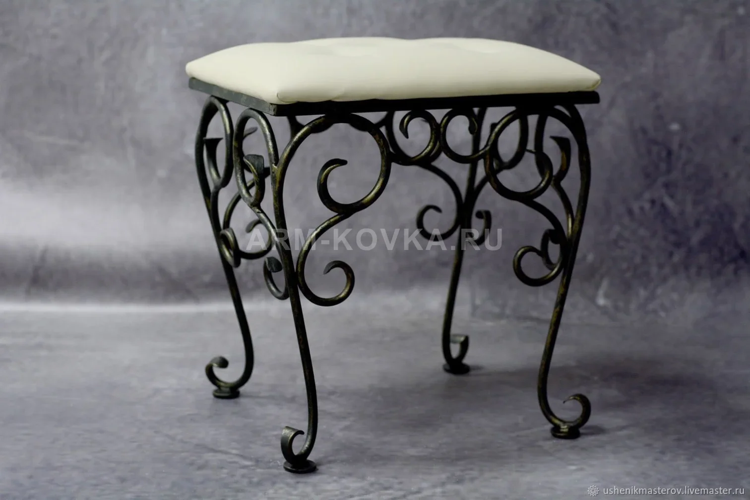 Компактный и изящный пуф, который станет идеальным дополнением к туалетному столику или прихожей в загородных домах Истринского района. Модель «Прованс» сочетает в себе визуальную легкость кованого металла и комфорт мягкой обивки, привнося в интерьер атмосферу европейского уюта и классического стиля. Основание пуфа представляет собой искусное переплетение кованых завитков и S-образных волют, которые образуют прочный и устойчивый каркас. Тонкие изогнутые ножки завершаются аккуратными волютами, обеспечивая устойчивость конструкции и придавая ей завершенный художественный вид. Верхняя часть изделия увенчана мягкой подушкой из качественной экокожи молочного цвета, которая легко поддается чистке и сохраняет свой первоначальный вид на протяжении долгого времени. Металлический каркас проходит тщательную ручную обработку и покрывается темной кузнечной краской с золотистым патинированием. Такой эффект подчеркивает каждую линию ковки, создавая благородный антикварный блеск. Пуф «Прованс» — это гармоничное сочетание функциональности и художественной эстетики, созданное для того, чтобы подчеркнуть индивидуальность вашего интерьера.