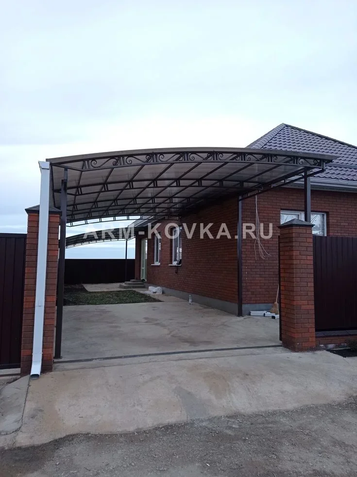Монументальный отдельно стоящий навес, состоящий из двух последовательно соединенных арочных секций. Такая архитектура позволяет перекрывать значительную площадь, обеспечивая комфортную парковку для нескольких автомобилей или создавая просторную защищенную зону перед гаражом. Силовой каркас базируется на мощных сдвоенных опорах и усиленных фермах с треугольным наполнением, что обеспечивает максимальную жесткость конструкции на больших пролетах. Кровельное покрытие реализовано из сотового поликарбоната бронзового оттенка, который мягко пропускает свет, отсекая при этом вредное УФ-излучение. Металлоконструкция окрашена в глубокий вишнево-коричневый цвет, подчеркивающий геометрию ферм. Навес оснащен скоординированной системой водоотвода, проложенной вдоль несущих балок, что обеспечивает сухую поверхность на всей площадке, выложенной керамической плиткой.