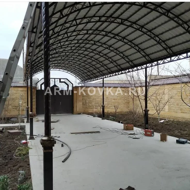 Конструкция представляет собой монументальный отдельно стоящий навес арочного типа с увеличенной полезной высотой. Главной архитектурной особенностью являются несущие опоры, выполненные из витой трубы с декоративными литыми основаниями и капителями, окрашенными под патинированную бронзу. Вдоль всей длины навеса установлена декоративная кованая ферма с ажурным наполнением, выполняющая роль ребра жесткости и декоративного фриза. Кровельное покрытие реализовано из профилированного металлического листа с антиконденсатным покрытием. Использование частого шага арочных ферм и поперечных прогонов обеспечивает максимальную устойчивость к экстремальным снеговым и ветровым нагрузкам. Внутренняя часть свода имеет эстетичный вид благодаря аккуратному исполнению сварных узлов и однотонной окраске каркаса. Металлоконструкция прошла премиальную антикоррозийную подготовку и окрашена кузнечной эмалью с глубоким матовым финишем. Основание площадки подготовлено под заливку бетоном или укладку брусчатки, опоры установлены на массивные закладные. Дизайн изделия идеально сочетается с геометричными коваными воротами, расположенными на заднем плане, создавая единый архитектурный ансамбль в классическом стиле.