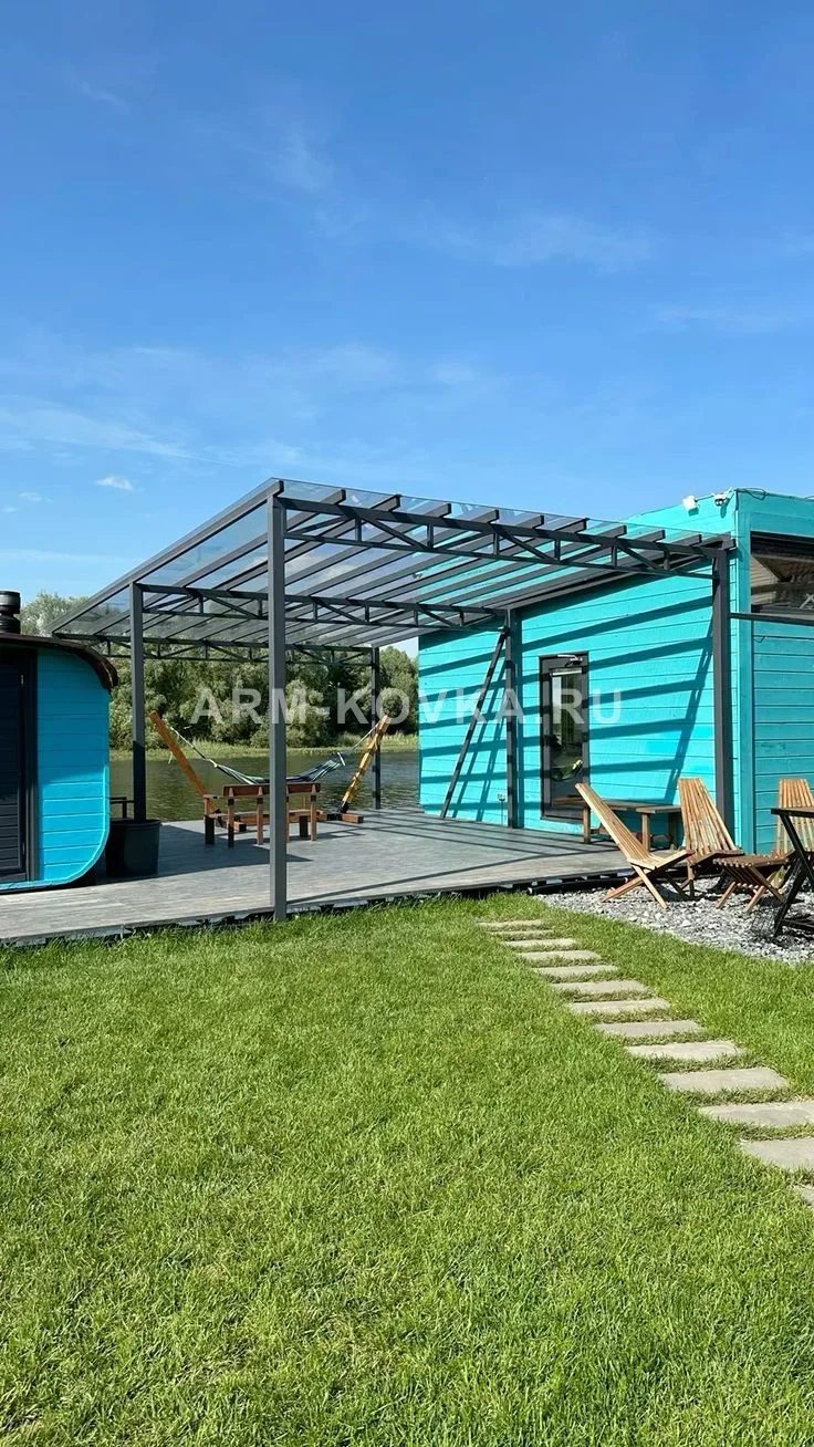 Лаконичный односкатный навес, спроектированный для оформления прибрежной зоны отдыха или открытой террасы. Конструкция отличается строгой геометрией и отсутствием лишних декоративных деталей, что идеально подходит для объектов в стиле хай-тек или минимализм. Каркас выполнен из стального профиля прямоугольного сечения, окрашенного в глубокий матовый графитовый цвет. Кровля реализована из прозрачного монолитного или качественного сотового поликарбоната. Прозрачность материала позволяет сохранить максимальное естественное освещение на террасе и не перекрывает вид на окружающий ландшафт. Уклон ската рассчитан на эффективный отвод дождевой воды в сторону от основной площадки. Силовая часть состоит из плоских ферм с параллельными поясами, которые обеспечивают необходимую жесткость при сохранении визуальной легкости конструкции. Опоры навеса надежно закреплены на деревянном настиле или бетонном основании. Все узловые соединения выполнены с высокой точностью, что подчеркивает технологичность изделия. Данное решение оптимально для защиты зон отдыха с шезлонгами, гамаками и уличной мебелью от осадков, сохраняя при этом ощущение открытого пространства.