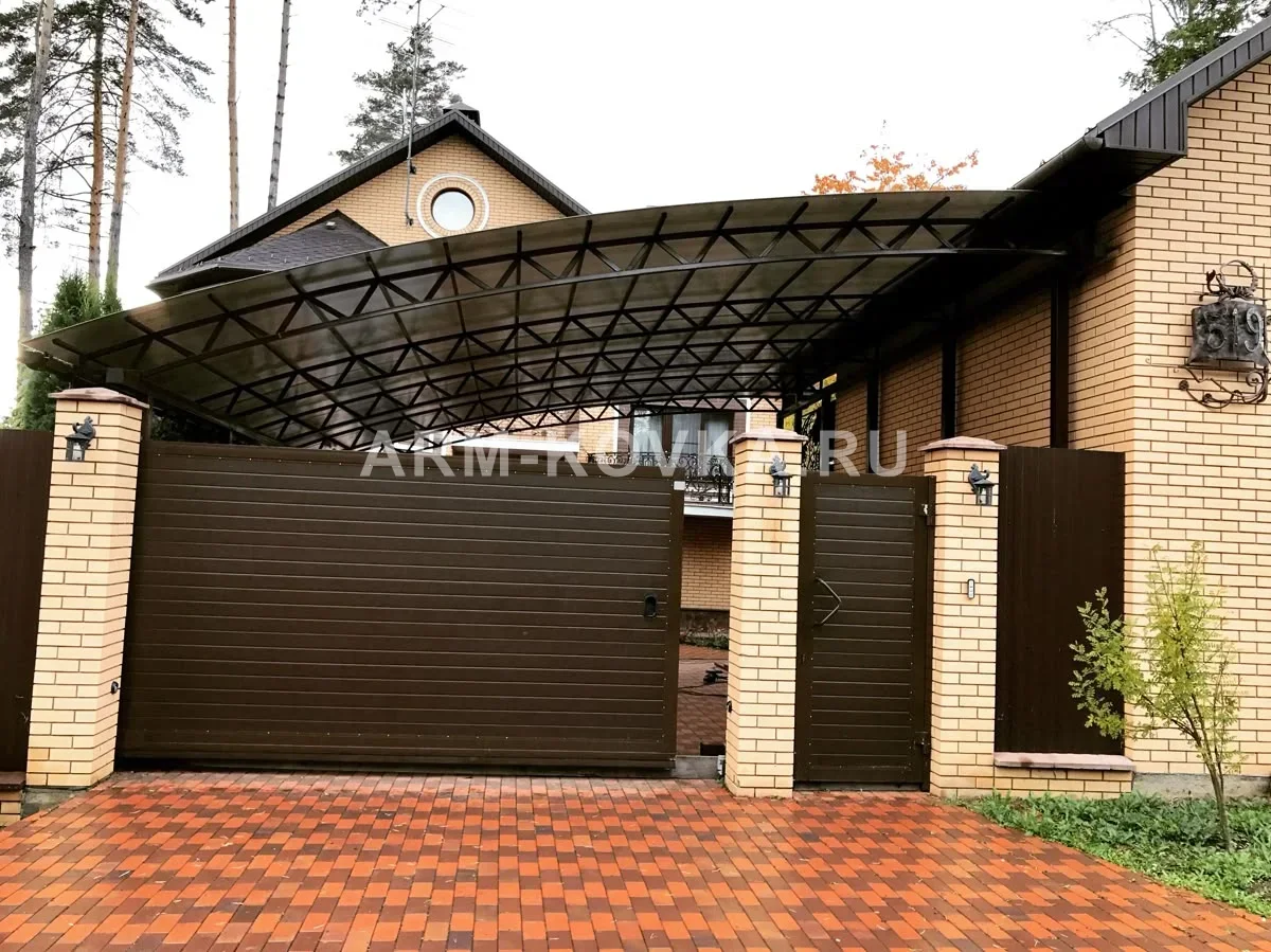 Данная конструкция представляет собой стационарный навес арочного типа, смонтированный по пристенной схеме. С одной стороны несущие элементы каркаса (столбы) опираются на кирпичные колонны въездной группы, а с другой — закреплены непосредственно на фасадной стене загородного дома. Такой подход обеспечивает максимальную экономию пространства и монолитность въездной зоны. Каркас изготовлен из профильной стальной трубы, окрашенной в темно-коричневый цвет (близкий к RAL 8017), что гармонирует с цветом ворот и отделкой дома. Основу несущей системы составляют мощные решетчатые фермы, выполненные по индивидуальному проекту. Верхний пояс ферм имеет плавный изгиб (дугу), а раскосы и стойки внутри фермы образуют жесткую треугольную решетку, обеспечивающую высокую несущую способность при значительных снеговых и ветровых нагрузках. На фермах закреплены прогоны из более мелкого профиля, служащие основанием для кровельного покрытия. Вся металлоконструкция прошла антикоррозийную обработку и покрыта финишной эмалью с матовым эффектом. Кровля выполнена из сотового поликарбоната премиум-класса, имеющего бронзовый (тонированный) оттенок. Использование такого материала позволяет защитить въездную зону и автомобиль от осадков и прямых солнечных лучей, при этом сохраняя комфортный уровень естественной освещенности без создания густой тени. Крепление листов поликарбоната осуществляется с использованием специализированных профилей и термошайб, что компенсирует термическое расширение и гарантирует герметичность стыков. Изгиб кровли способствует естественному сходу снега. Особенностью данного навеса является его сложная интеграция в существующую архитектуру: он объединяет в единый комплекс автоматические откатные ворота, калитку, кирпичные столбы забора и стену дома. Конструкция выглядит очень надежно и эстетично. Вдоль пристенной стороны предусмотрена водосточная система, скрыто отводящая талую и дождевую воду. Судя по фото, работы выполнены с высоким уровнем точности, включая примыкание к стене дома и установку декоративных фонарей на столбах.