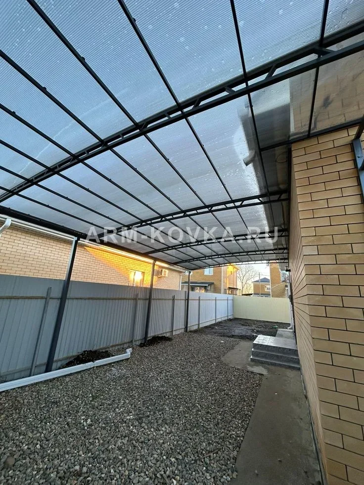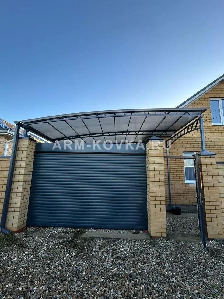 Конструкция представляет собой стационарный навес арочного типа, интегрированный в архитектуру фасадного забора и примыкающий к стене жилого дома. Несущая система базируется на капитальных кирпичных столбах и дополнительных стальных опорах из профильной трубы. Такая компоновка позволяет максимально эффективно использовать пространство между домом и границей участка, создавая полностью защищенную от осадков зону въезда. Каркас кровли выполнен на основе легких решетчатых ферм с треугольным заполнением, что обеспечивает высокую жесткость на изгиб при малом собственном весе. Все металлические элементы окрашены в антрацитовый цвет (RAL 7016), идеально гармонирующий с цветом рольворот и калитки. Геометрия арок рассчитана таким образом, чтобы не создавать помех для работы подъемного механизма роллетной системы ворот. В качестве кровельного покрытия используется сотовый поликарбонат с высокой степенью тонировки. Материал эффективно блокирует прямые солнечные лучи и ультрафиолет, защищая покрытие ворот и пространство калитки от выгорания и перегрева. Листы зафиксированы с помощью специализированных стыковочных профилей, обеспечивающих герметичность узла примыкания к стене здания и надежный отвод воды в желоба. Конструкция оснащена полноценной системой водостока: желоб расположен по нижнему краю ската и соединен с вертикальной трубой, закрепленной вдоль опорного столба. Это исключает подтопление фундамента и размывание грунта перед въездом. Проект отличается высокой эргономичностью, объединяя в единый узел защиту автомобиля, входной группы и инженерных систем управления доступом.