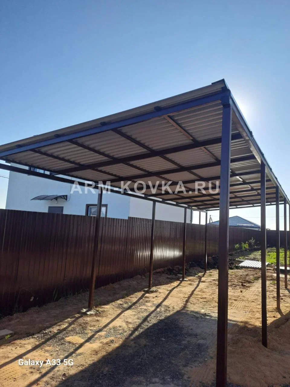 Конструкция представляет собой функциональный пристенный навес односкатного типа, предназначенный для организации крытой парковки вдоль забора или фасада. Каркас базируется на ряде вертикальных опор из стальной профильной трубы, жестко закрепленных в грунте. Пристенное исполнение позволяет эффективно использовать узкие зоны участка, обеспечивая надежную защиту транспортного средства от прямых осадков и солнечных лучей. Несущая система кровли выполнена в виде плоских наклонных балок, усиленных перпендикулярными прогонами. Простая, но надежная геометрия каркаса рассчитана на снеговые нагрузки московского региона. Все металлические элементы прошли антикоррозийную обработку и окрашены износостойкой эмалью темно-коричневого цвета (RAL 8017), что обеспечивает эстетическое единство с существующим ограждением из профлиста. В качестве кровельного покрытия использован профилированный стальной лист с полимерным защитным слоем. Выбор профнастила обусловлен его высокой механической прочностью, негорючестью и длительным сроком службы. Листы уложены с нахлестом и зафиксированы кровельными саморезами с уплотнительными шайбами, что гарантирует полную герметичность кровли и отсутствие протечек в местах крепления. Конструкция отличается высокой скоростью монтажа и практичностью в эксплуатации. Благодаря значительному выносу ската, навес перекрывает большую площадь, оставляя пространство под ним сухим и чистым. Односкатная форма способствует направленному сходу снега и воды в сторону от основной территории двора, что упрощает уборку участка в зимний период.
