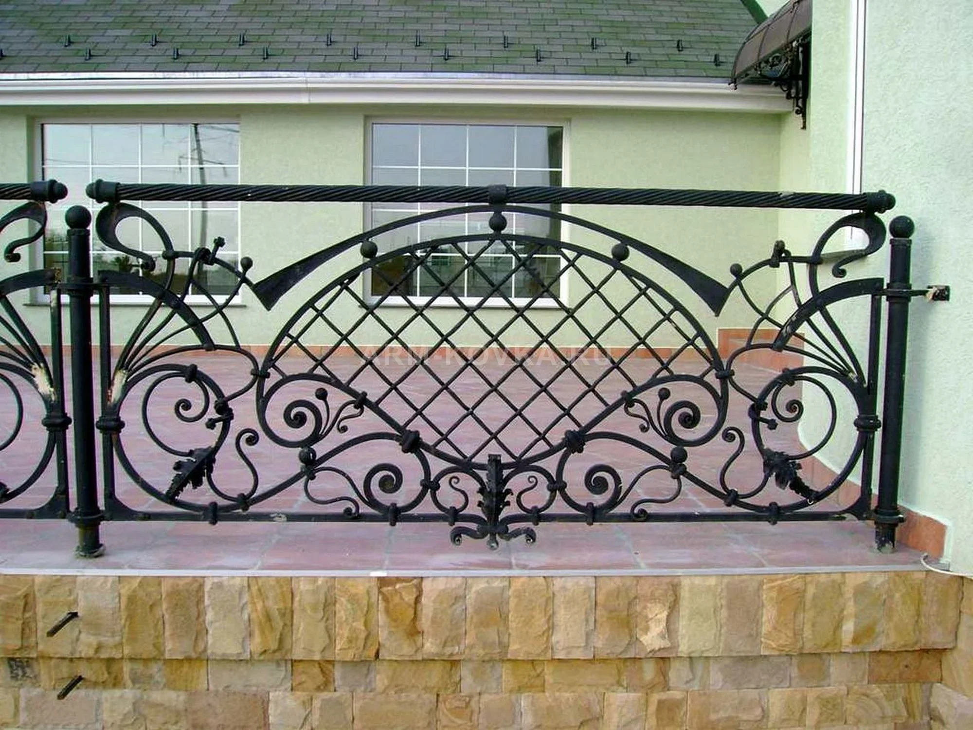 Художественное кованое ограждение с оригинальной геометрической композицией, созданное для оформления просторных террас, балконов и веранд загородных домов в Истринском районе. Модель «Парус» выделяется на фоне классических решений своим смелым дизайном, в котором строгая диагональная решетка соседствует с изящными растительными завитками и барочными элементами. Центральная часть каждой секции акцентирована крупным арочным элементом, заполненным косой сеткой из стального прута. Эта «парусная» деталь придает конструкции визуальную устойчивость и ритмичность. Боковые части секции украшены сложными волютами и коваными листьями аканта, которые плавно переходят в опорные стойки. Особое внимание уделено поручню: он выполнен из массивного витого торсиона, что обеспечивает не только эстетическую привлекательность, но и удобный хват. Конструкция изготовлена из высококачественного полнотелого металла, что гарантирует ее прочность и безопасность при эксплуатации на высоте. Поверхность обработана антикоррозийным грунтом и окрашена в классический черный цвет. Благодаря сочетанию различных техник ковки, ограждение «Парус» выглядит как эксклюзивное ювелирное изделие из металла, идеально дополняющее архитектурный облик современного коттеджа.