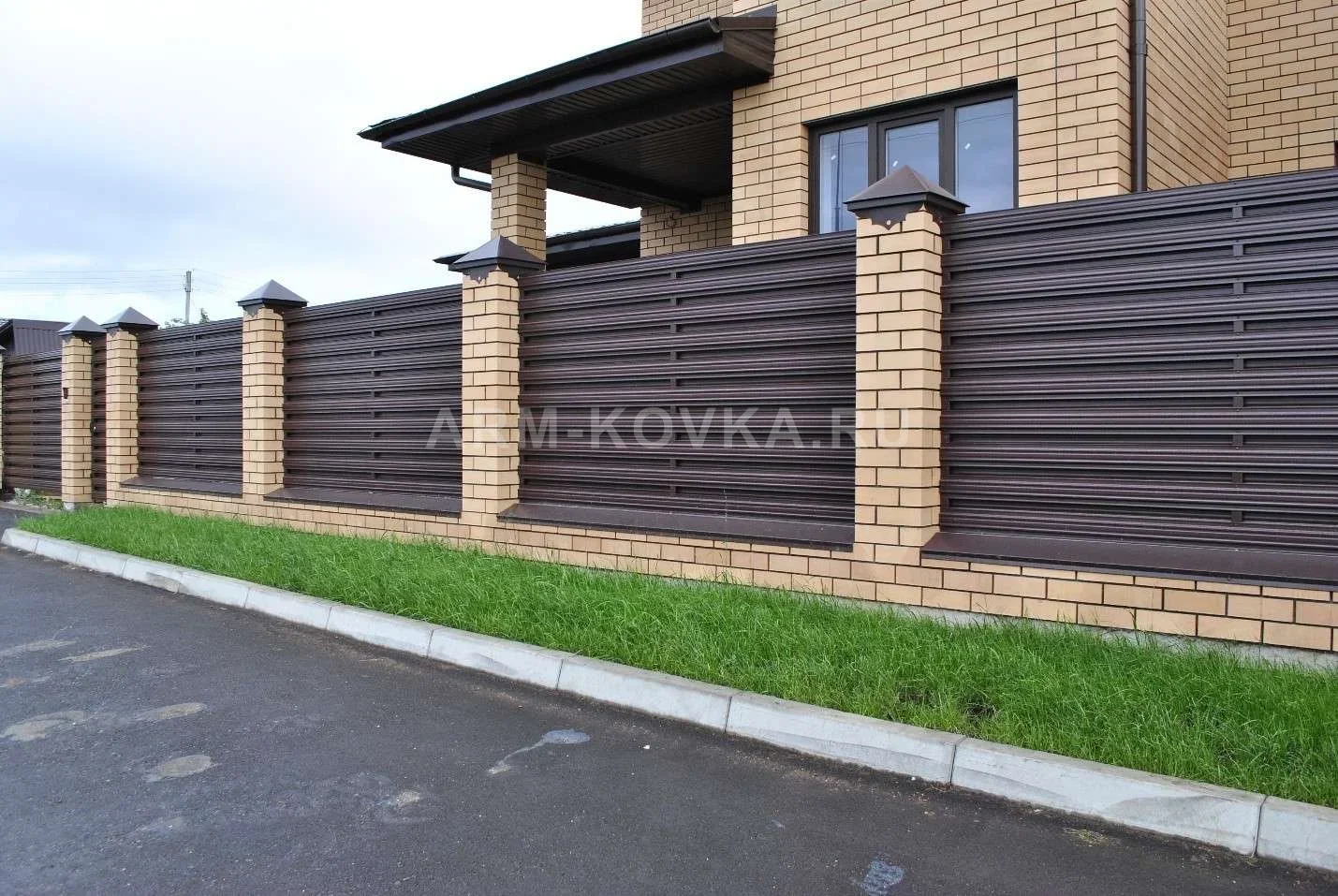 Современное и функциональное ограждение, обеспечивающее идеальный баланс между приватностью и вентиляцией участка. Модель «Жалюзи» является одним из самых востребованных решений для загородного строительства в Истринском районе благодаря своей технологичности, долговечности и эстетичному внешнему виду, который отлично сочетается с современной архитектурой. Конструкция секции состоит из стальных ламелей, расположенных под определенным углом. Такое устройство создает эффект «односторонней видимости»: снаружи участок надежно скрыт от любопытных глаз, в то время как изнутри сохраняется частичный обзор прилегающей территории. Кроме того, наклонные ламели обеспечивают свободную циркуляцию воздуха и пропускают рассеянный солнечный свет, что благотворно сказывается на садовых растениях вдоль забора. Секции монтируются между капитальными столбами из облицовочного кирпича светлого оттенка, что придает всей конструкции солидность и массивность. Каждый столб увенчан металлическим четырехскатным колпаком, а фундамент защищен отливами в цвет основного полотна. Изделие выполнено из оцинкованной стали с двусторонним полимерным покрытием насыщенного коричневого цвета (RAL 8017), обладающим высокой устойчивостью к коррозии, выцветанию и механическим повреждениям. Забор «Жалюзи» — это надежное, стильное и не требующее сложного ухода решение для вашего дома.